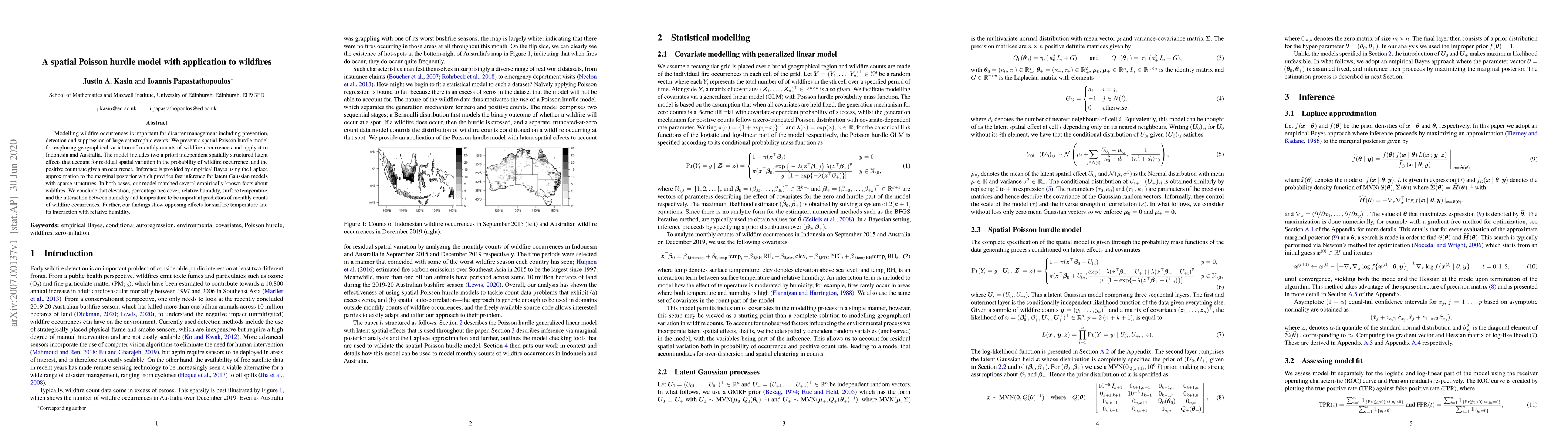 Modelling wildfire occurrences is important for disaster management including prevention, detection and suppression of large catastrophic events. We present a spatial Poisson hurdle model for exploring geographical variation of monthly counts of wildfire occurrences and apply it to Indonesia and Australia. The model includes two a priori independent spatially structured latent effects that account for residual spatial variation in the probability of wildfire occurrence, and the positive count rate given an occurrence. Inference is provided by empirical Bayes using the Laplace approximation to the marginal posterior which provides fast inference for latent Gaussian models with sparse structures. In both cases, our model matched several empirically known facts about wildfires. We conclude that elevation, percentage tree cover, relative humidity, surface temperature, and the interaction between humidity and temperature to be important predictors of monthly counts of wildfire occurrences. Further, our findings show opposing effects for surface temperature and its interaction with relative humidity.