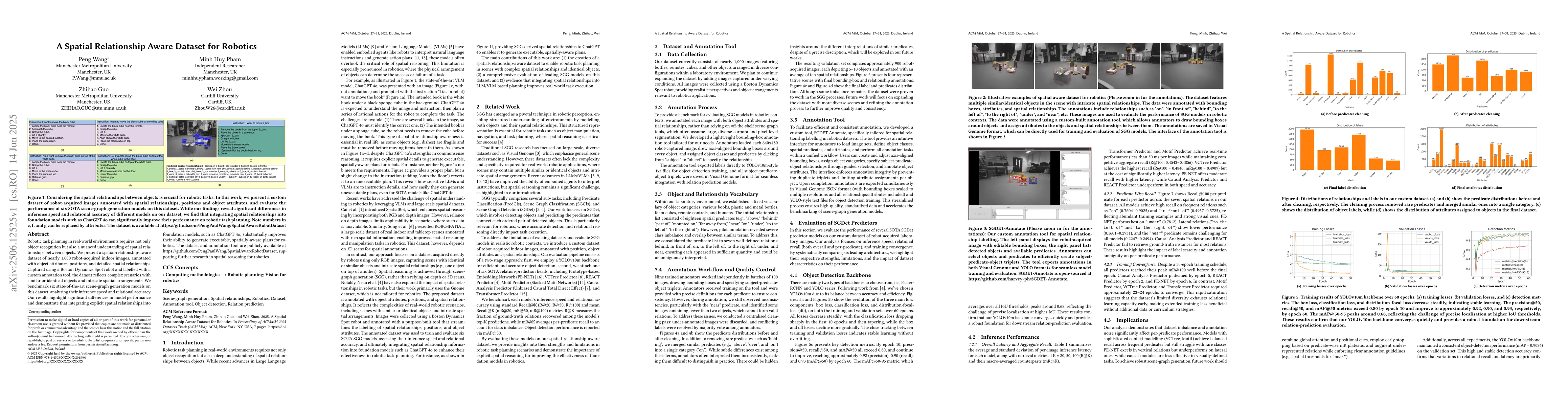 Robotic task planning in real-world environments requires not only object recognition but also a nuanced understanding of spatial relationships between objects. We present a spatial-relationship-aware dataset of nearly 1,000 robot-acquired indoor images, annotated with object attributes, positions, and detailed spatial relationships. Captured using a Boston Dynamics Spot robot and labelled with a custom annotation tool, the dataset reflects complex scenarios with similar or identical objects and intricate spatial arrangements. We benchmark six state-of-the-art scene-graph generation models on this dataset, analysing their inference speed and relational accuracy. Our results highlight significant differences in model performance and demonstrate that integrating explicit spatial relationships into foundation models, such as ChatGPT 4o, substantially improves their ability to generate executable, spatially-aware plans for robotics. The dataset and annotation tool are publicly available at https://github.com/PengPaulWang/SpatialAwareRobotDataset, supporting further research in spatial reasoning for robotics.