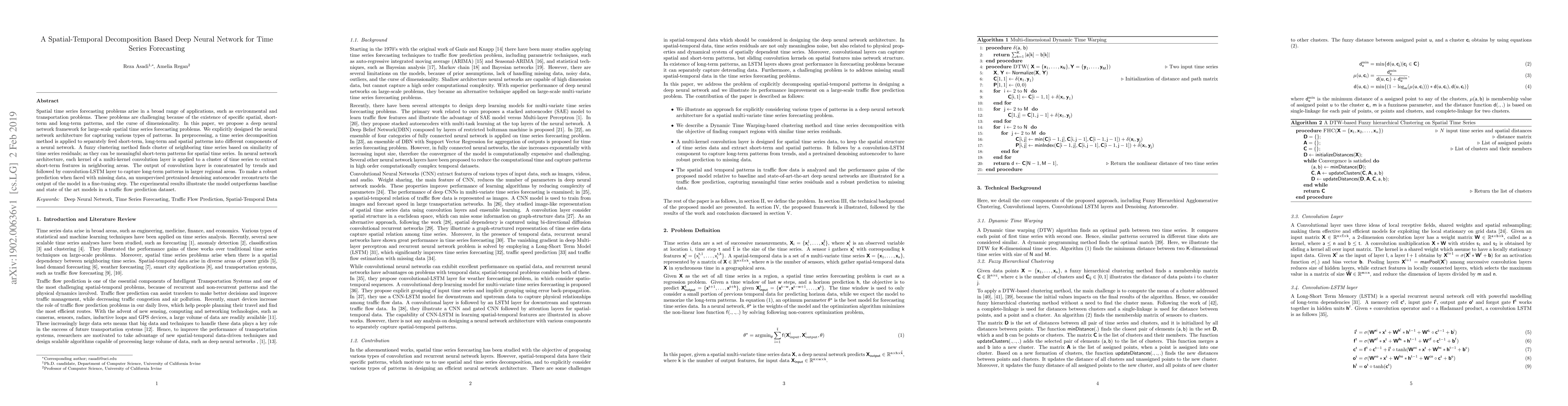 This paper proposes a deep neural network for spatial time series forecasting, leveraging spatial-temporal decomposition and convolutional-LSTM layers to capture various patterns. An unsupervised denoising autoencoder aids in handling missing data, and the model shows superior performance in traffic flow prediction.