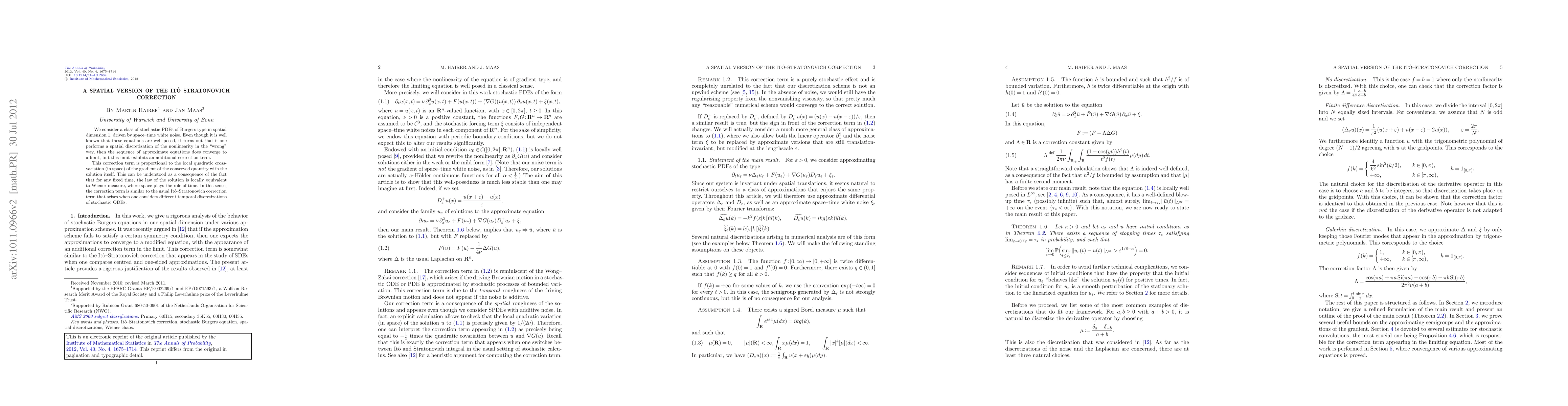 This research identifies a spatial It^{o}-Stratonovich correction term for stochastic PDEs of Burgers type in one spatial dimension, driven by space-time white noise. The correction emerges from incorrect spatial discretization of nonlinearity, resembling temporal discretization corrections in stochastic ODEs, due to local equivalence of solution law to Wiener measure in space.