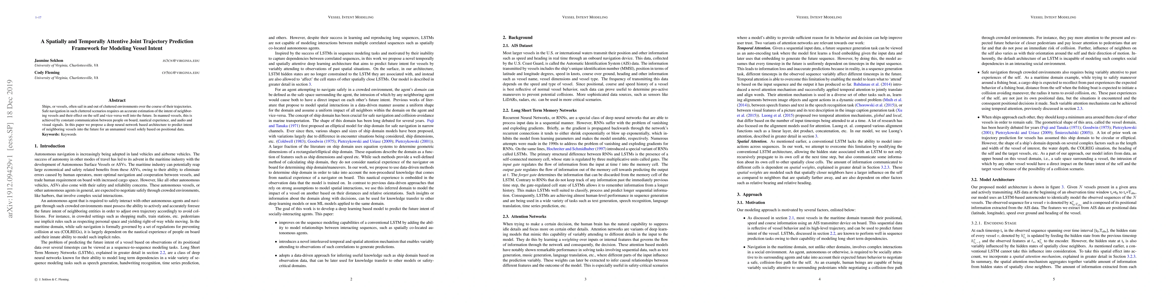 Ships, or vessels, often sail in and out of cluttered environments over the course of their trajectories. Safe navigation in such cluttered scenarios requires an accurate estimation of the intent of neighboring vessels and their effect on the self and vice-versa well into the future. In manned vessels, this is achieved by constant communication between people on board, nautical experience, and audio and visual signals. In this paper we propose a deep neural network based architecture to predict intent of neighboring vessels into the future for an unmanned vessel solely based on positional data.