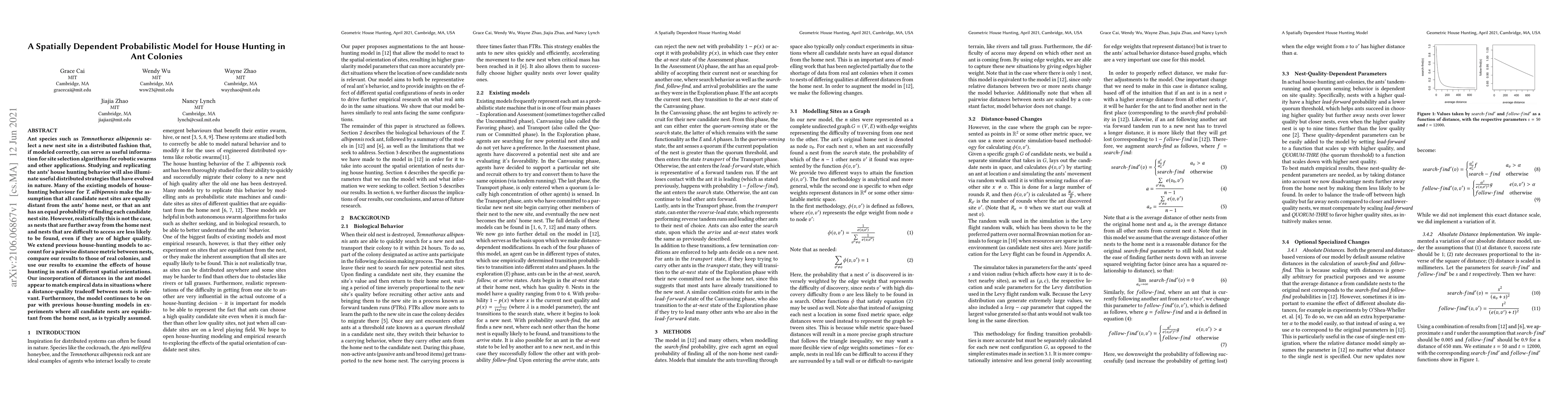 Ant species such as Temnothorax albipennis select a new nest site in a distributed fashion that, if modeled correctly, can serve as useful information for site selection algorithms for robotic swarms and other applications. Studying and replicating the ants' house hunting behavior will also illuminate useful distributed strategies that have evolved in nature. Many of the existing models of househunting behaviour for T. albipennis make the assumption that all candidate nest sites are equally distant from the ants' home nest, or that an ant has an equal probability of finding each candidate nest site. However, realistically this is not the case, as nests that are further away from the home nest and nests that are difficult to access are less likely to be found, even if they are of higher quality. We extend previous house-hunting models to account for a pairwise distance metric between nests, compare our results to those of real colonies, and use our results to examine the effects of house hunting in nests of different spatial orientations. Our incorporation of distances in the ant model appear to match empirical data in situations where a distance-quality tradeoff between nests is relevant. Furthermore, the model continues to be on par with previous house-hunting models in experiments where all candidate nests are equidistant from the home nest, as is typically assumed.