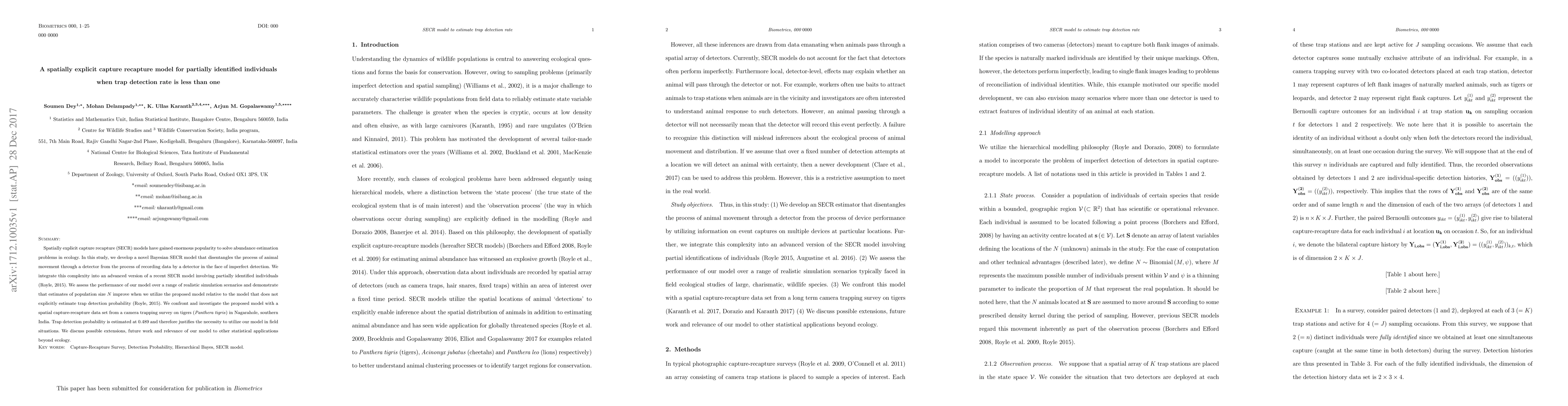 This paper develops a novel Bayesian spatially explicit capture recapture model to improve abundance estimation in ecology, especially for partially identified individuals with imperfect detection. The proposed model explicitly estimates trap detection probability, leading to more accurate population size estimates compared to existing models.