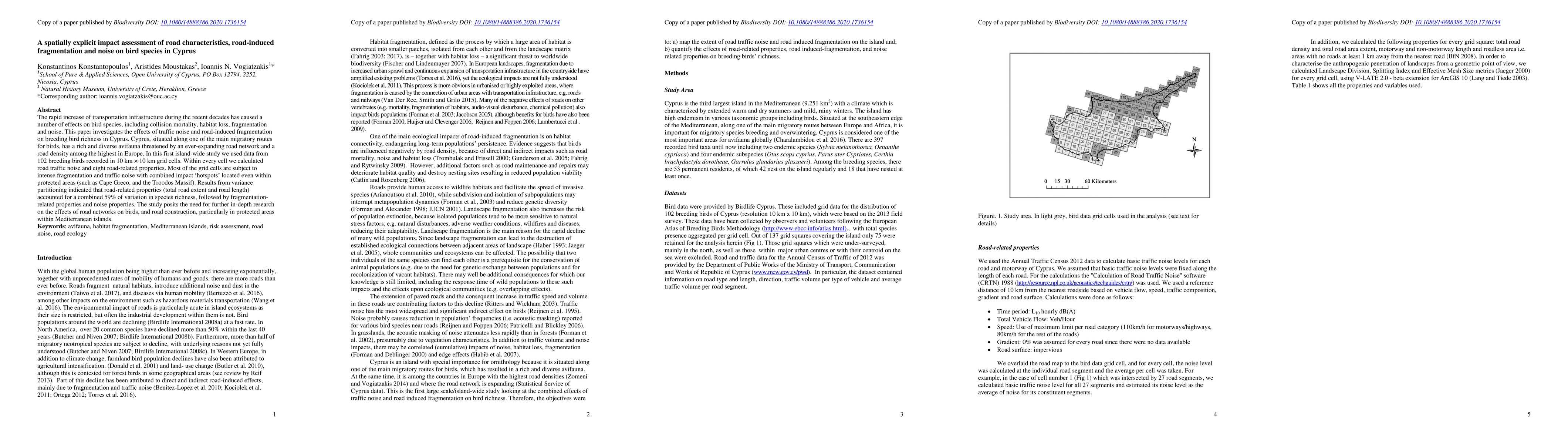 A study in Cyprus found that road noise and fragmentation have a significant impact on bird species richness, accounting for 59% of variation in species richness. The findings highlight the need for further research on the effects of road networks on birds, particularly in protected areas in Mediterranean islands.