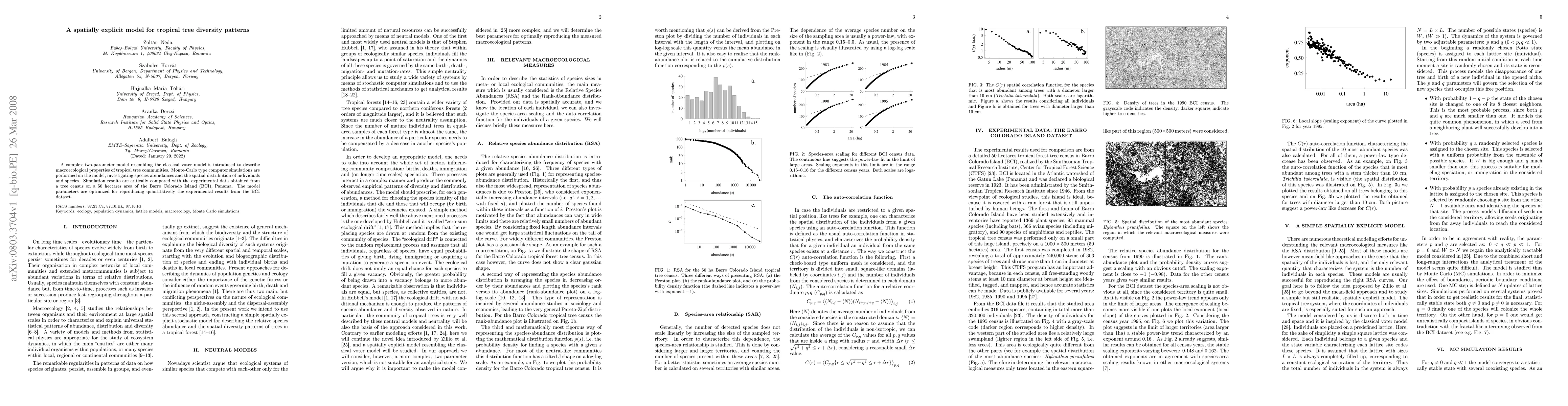 A complex two-parameter model resembling the classical voter model is introduced to describe macroecological properties of tropical tree communities. Monte-Carlo type computer simulations are performed on the model, investigating species abundances and the spatial distribution of individuals and species. Simulation results are critically compared with the experimental data obtained from a tree census on a 50 hectares area of the Barro Colorado Island (BCI), Panama. The model parameters are optimized for reproducing quantitatively the experimental results from the BCI dataset.