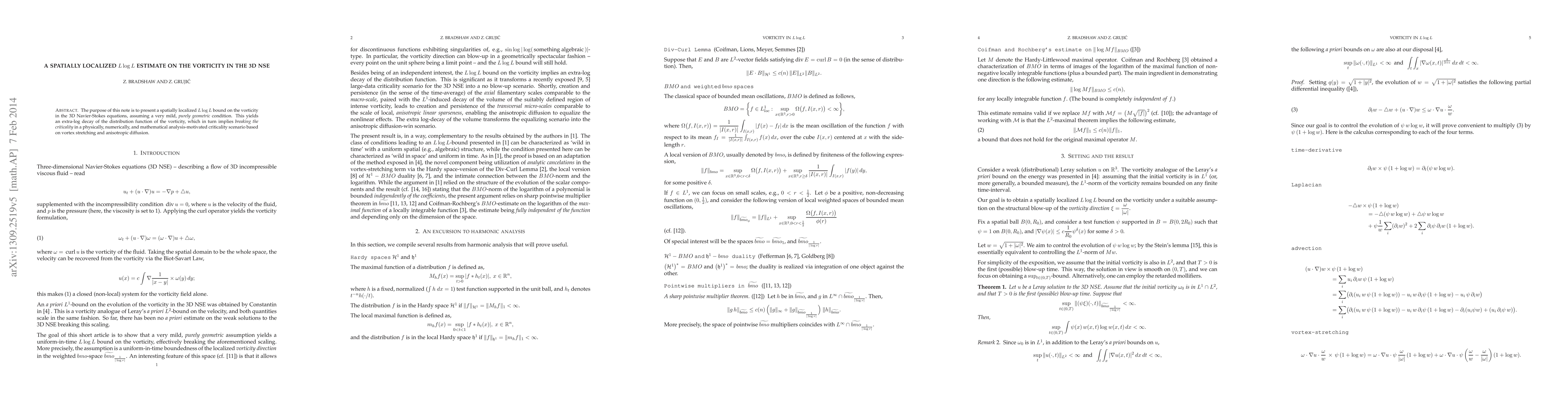 The purpose of this note is to present a spatially localized $L \log L$ bound on the vorticity in the 3D Navier-Stokes equations, assuming a very mild, \emph{purely geometric} condition. This yields an extra-log decay of the distribution function of the vorticity, which in turn implies \emph{breaking the criticality} in a physically, numerically, and mathematical analysis-motivated blow-up scenario based on vortex stretching and anisotropic diffusion.