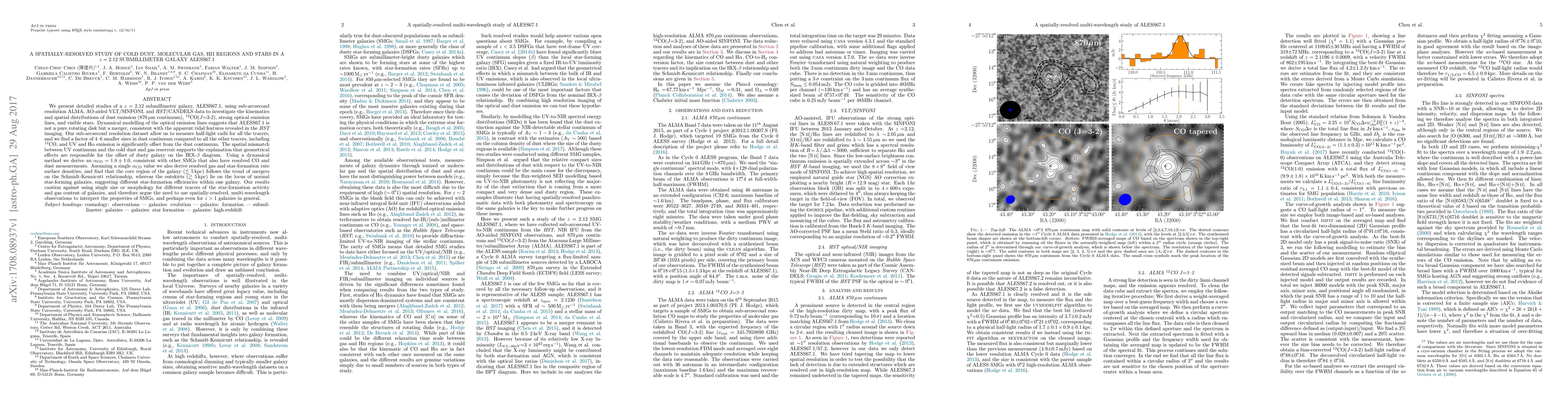 This study uses ALMA, VLT/SINFONI, and HST/CANDELS data to analyze the spatial distributions and kinematics of cold dust, molecular gas, HII regions, and stars in the $z=2.12$ submillimeter galaxy ALESS67.1, revealing it to be a merger rather than a rotating disk. The cold dust is found to be significantly offset from the UV and H$\alpha$ emission, suggesting different star-formation efficiencies across the galaxy.