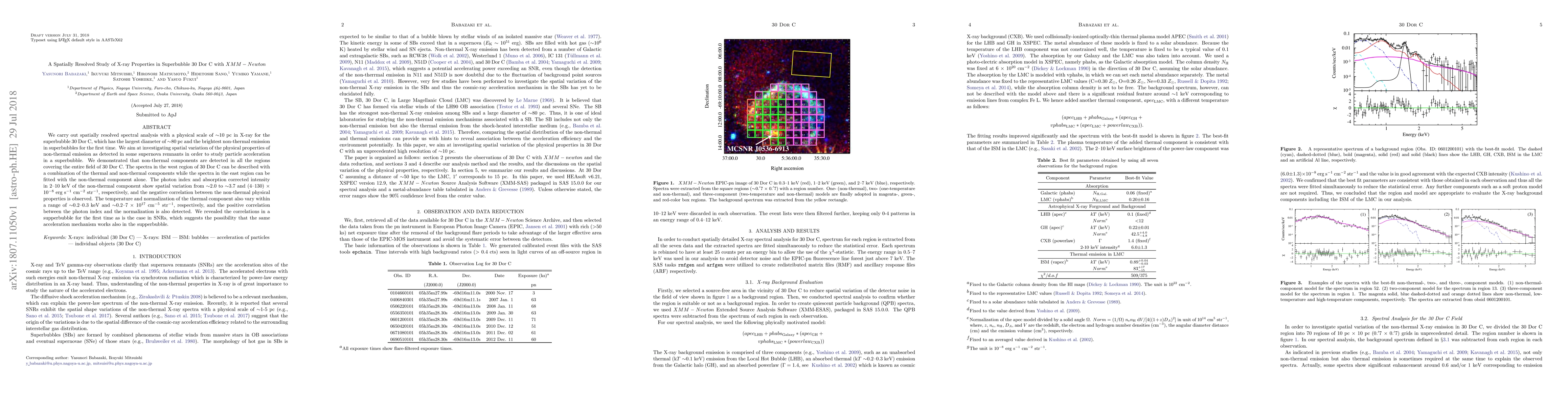 Researchers studied X-ray properties in Superbubble 30 Dor C with $XMM-Newton$, finding non-thermal components across the entire field, varying photon index and intensity, and correlations between thermal and non-thermal properties.