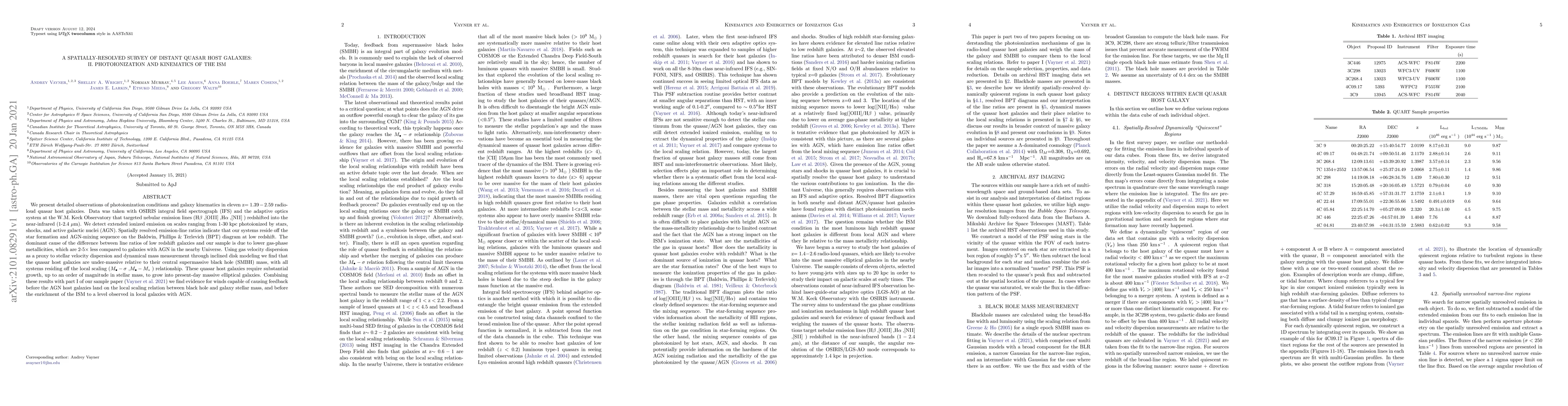 We present detailed observations of photoionization conditions and galaxy kinematics in eleven z$=1.39-2.59$ radio-loud quasar host galaxies. Data was taken with OSIRIS integral field spectrograph (IFS) and the adaptive optics system at the W.M. Keck Observatory that targeted nebular emission lines (H$\beta$,[OIII],H$\alpha$,[NII]) redshifted into the near-infrared (1-2.4 \micron). We detect extended ionized emission on scales ranging from 1-30 kpc photoionized by stars, shocks, and active galactic nuclei (AGN). Spatially resolved emission-line ratios indicate that our systems reside off the star formation and AGN-mixing sequence on the Baldwin, Phillips $\&$ Terlevich (BPT) diagram at low redshift. The dominant cause of the difference between line ratios of low redshift galaxies and our sample is due to lower gas-phase metallicities, which are 2-5$\times$ less compared to galaxies with AGN in the nearby Universe. Using gas velocity dispersion as a proxy to stellar velocity dispersion and dynamical mass measurement through inclined disk modeling we find that the quasar host galaxies are under-massive relative to their central supermassive black hole (SMBH) mass, with all systems residing off the local scaling ($M_{\bullet}-\sigma~$,$M_{\bullet}-M_{*}~$) relationship. These quasar host galaxies require substantial growth, up to an order of magnitude in stellar mass, to grow into present-day massive elliptical galaxies. Combining these results with part I of our sample paper (Vayner et al. 2021) we find evidence for winds capable of causing feedback before the AGN host galaxies land on the local scaling relation between black hole and galaxy stellar mass, and before the enrichment of the ISM to a level observed in local galaxies with AGN.
