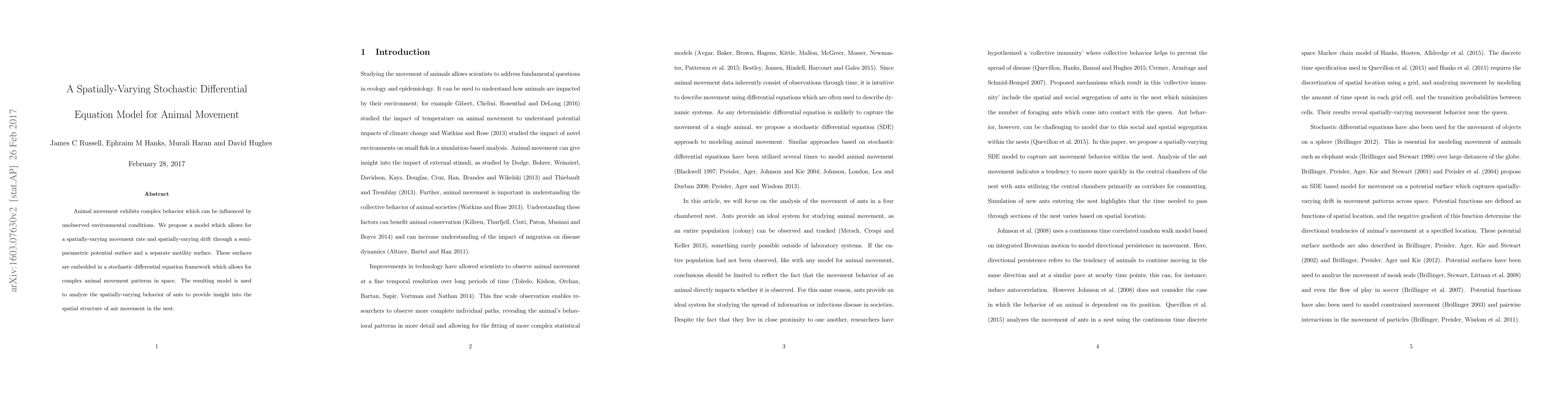 This paper proposes a spatially-varying stochastic differential equation model to capture complex animal movement influenced by unobserved environmental conditions. The model uses semiparametric potential and motility surfaces to analyze the spatially-varying movement behavior of ants, providing insights into the spatial structure of ant movement within nests.