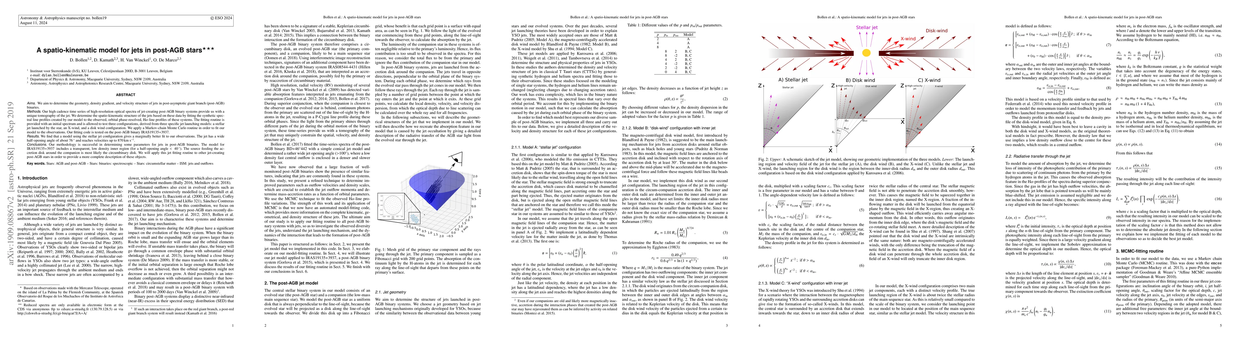 Aims. We aim to determine the geometry, density gradient, and velocity structure of jets in post-asymptotic giant branch (post-AGB) binaries. Methods. Our high cadence time series of high-resolution optical spectra of jet-creating post-AGB binary systems provide us with a unique tomography of the jet. We determine the spatio-kinematic structure of the jets based on these data by fitting the synthetic spectral line profiles created by our model to the observed, orbital phase-resolved, H{\alpha}-line profiles of these systems. The fitting routine is provided with an initial spectrum and is allowed to test three configurations, derived from three specific jet launching models: a stellar jet launched by the star, an X-wind, and a disk wind configuration. We apply a Markov-chain Monte Carlo routine in order to fit our model to the observations. Our fitting code is tested on the post-AGB binary IRAS19135+3937. Results. We find that a model using the stellar jet configuration gives a marginally better fit to our observations. The jet has a wide half-opening angle of about 76 degrees and reaches velocities up to 870 km/s. Conclusions. Our methodology is successful in determining some parameters for jets in post-AGB binaries. The model for IRAS19135+3937 includes a transparent, low density inner region (for a half-opening angle < 40 degrees). The source feeding the accretion disk around the companion is most likely the circumbinary disk. We will apply this jet fitting routine to other jet-creating post-AGB stars in order to provide a more complete description of these objects.