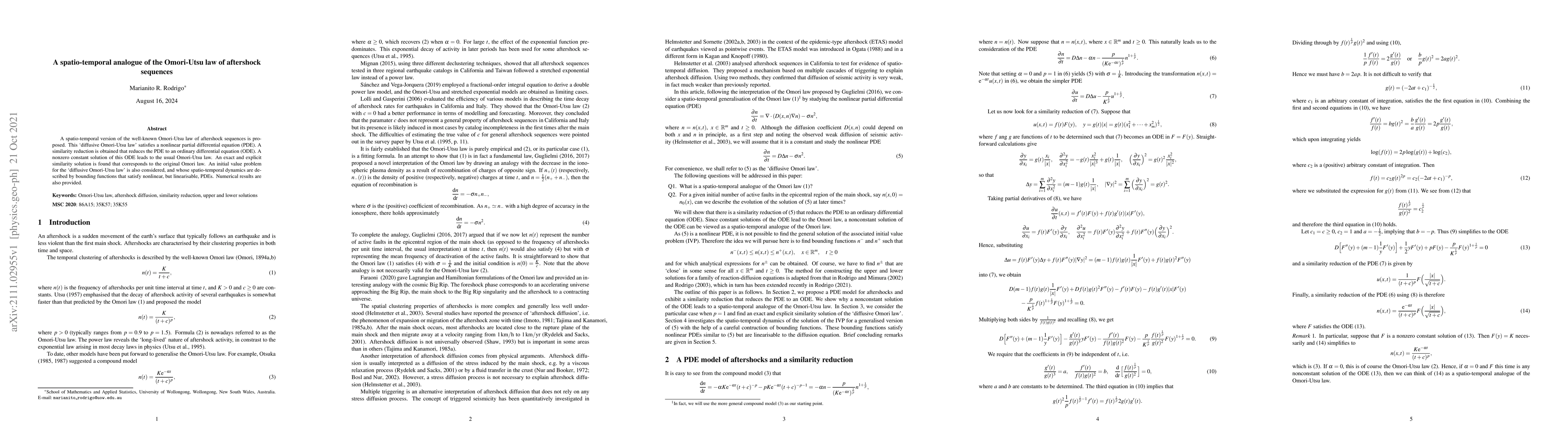A spatio-temporal version of the well-known Omori-Utsu law of aftershock sequences is proposed. This 'diffusive Omori-Utsu law' satisfies a nonlinear partial differential equation (PDE). A similarity reduction is obtained that reduces the PDE to an ordinary differential equation (ODE). A nonzero constant solution of this ODE leads to the usual Omori-Utsu law. An exact and explicit similarity solution is found that corresponds to the original Omori law. An initial value problem for the 'diffusive Omori-Utsu law' is also considered, and whose spatio-temporal dynamics are described by bounding functions that satisfy nonlinear, but linearisable, PDEs. Numerical results are also provided.