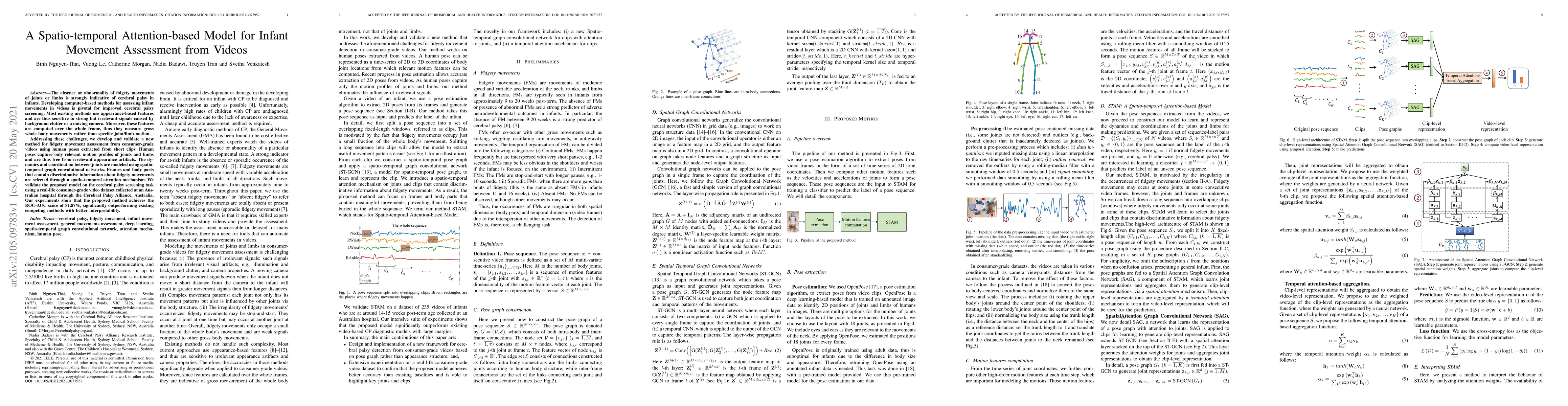 The paper proposes a new spatio-temporal attention-based model for assessing infant fidgety movements from videos, using human pose extraction and graph convolutional networks to focus on relevant joint/limb motion. The method outperforms existing methods in cerebral palsy screening with a ROC-AUC score of 81.87%.
