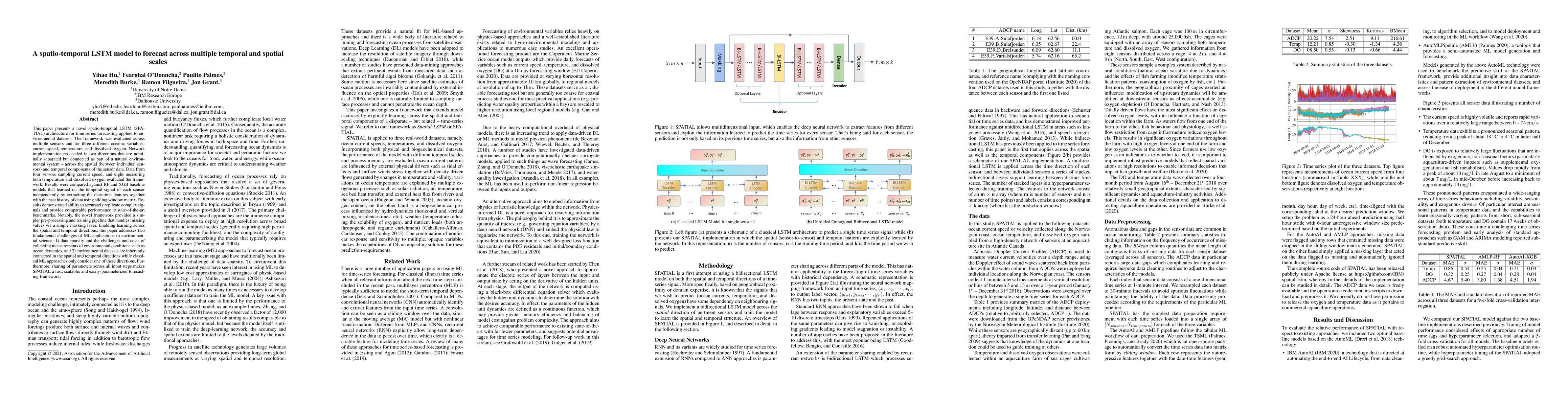 This paper presents a novel spatio-temporal LSTM (SPATIAL) architecture for time series forecasting applied to environmental datasets. The framework was evaluated across multiple sensors and for three different oceanic variables: current speed, temperature, and dissolved oxygen. Network implementation proceeded in two directions that are nominally separated but connected as part of a natural environmental system -- across the spatial (between individual sensors) and temporal components of the sensor data. Data from four sensors sampling current speed, and eight measuring both temperature and dissolved oxygen evaluated the framework. Results were compared against RF and XGB baseline models that learned on the temporal signal of each sensor independently by extracting the date-time features together with the past history of data using sliding window matrix. Results demonstrated ability to accurately replicate complex signals and provide comparable performance to state-of-the-art benchmarks. Notably, the novel framework provided a simpler pre-processing and training pipeline that handles missing values via a simple masking layer. Enabling learning across the spatial and temporal directions, this paper addresses two fundamental challenges of ML applications to environmental science: 1) data sparsity and the challenges and costs of collecting measurements of environmental conditions such as ocean dynamics, and 2) environmental datasets are inherently connected in the spatial and temporal directions while classical ML approaches only consider one of these directions. Furthermore, sharing of parameters across all input steps makes SPATIAL a fast, scalable, and easily-parameterized forecasting framework.