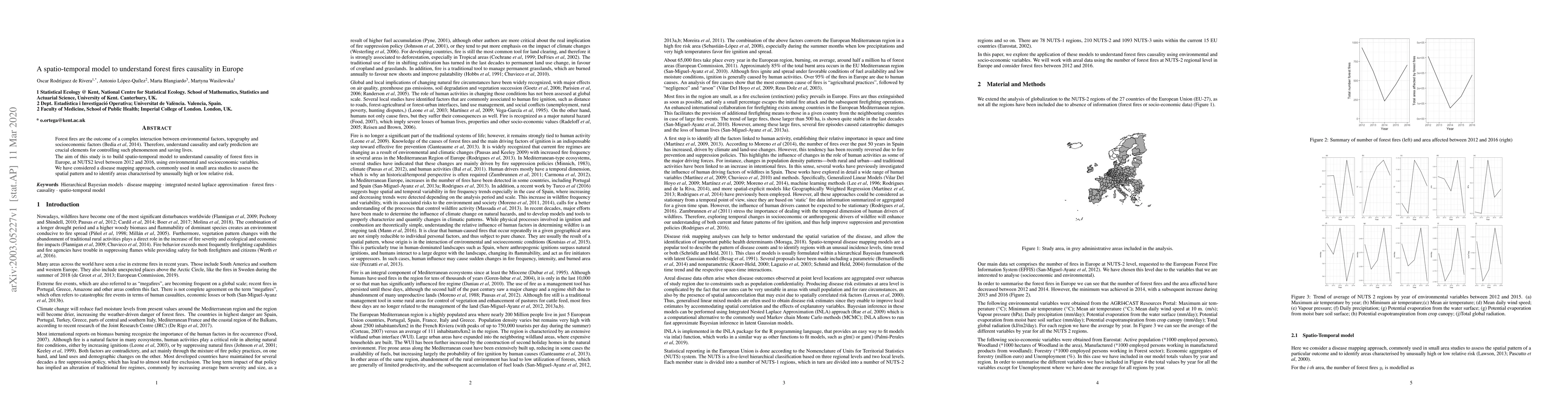 This study constructs a spatio-temporal model to analyze the causality of forest fires in Europe from 2012 to 2016, focusing on NUTS2 regions, utilizing environmental and socioeconomic variables to identify high-risk areas. The research employs a disease mapping approach to assess spatial patterns and relative risk.