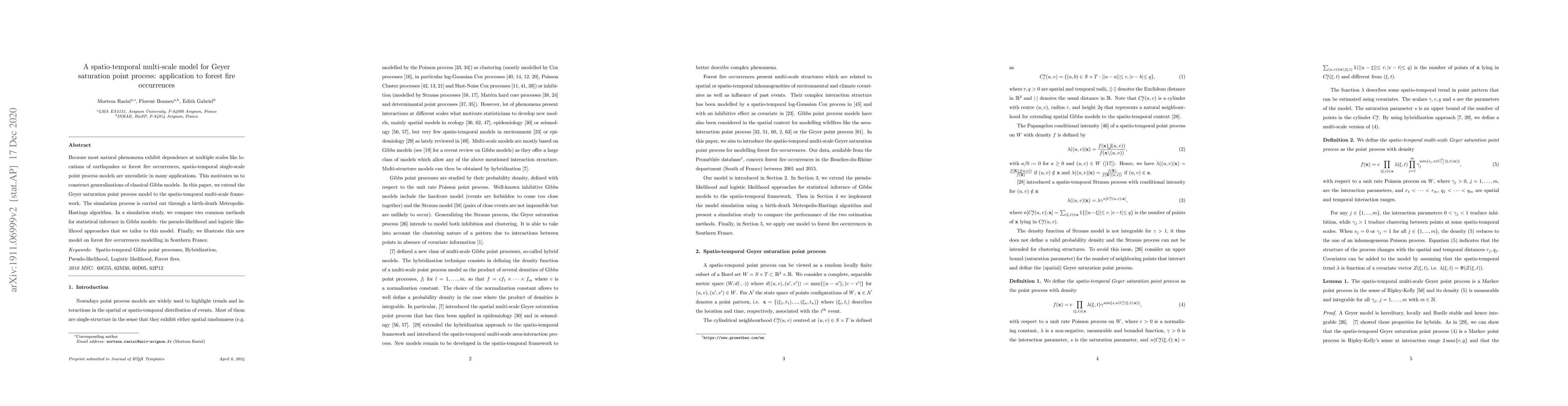 This paper proposes a spatio-temporal multi-scale Geyer saturation point process model to better capture the multi-scale dependencies in forest fire occurrences. It uses a birth-death Metropolis-Hastings algorithm for simulation and compares pseudo-likelihood and logistic likelihood methods for statistical inference, applying the model to forest fires in Southern France.