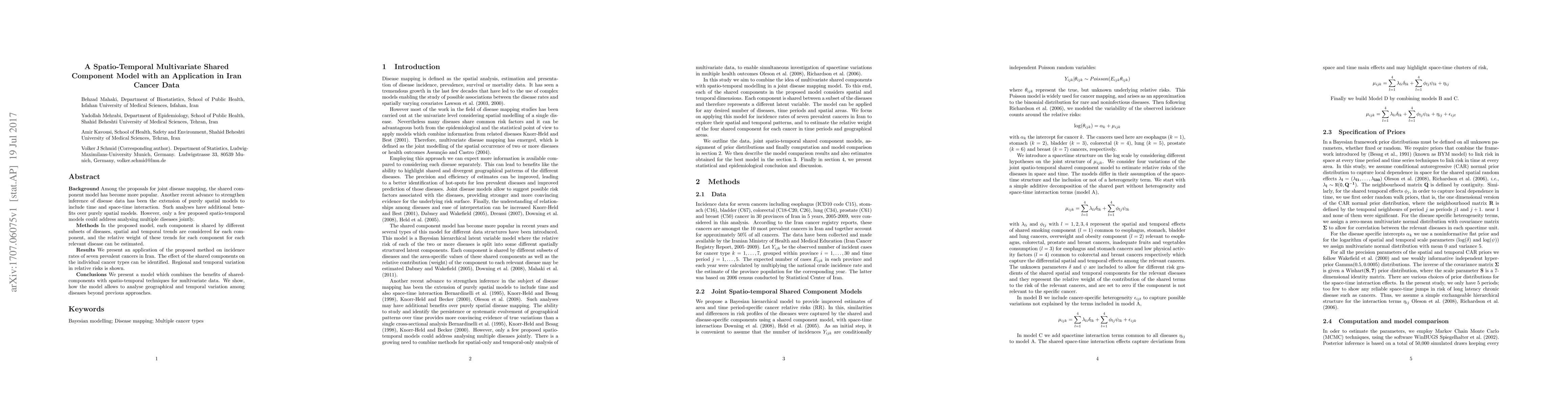 This paper proposes a spatio-temporal multivariate shared component model to analyze multiple diseases jointly, incorporating spatial and temporal trends. It applies this model to incidence rates of seven prevalent cancers in Iran, demonstrating its ability to identify shared components and regional/temporal variations in relative risks.