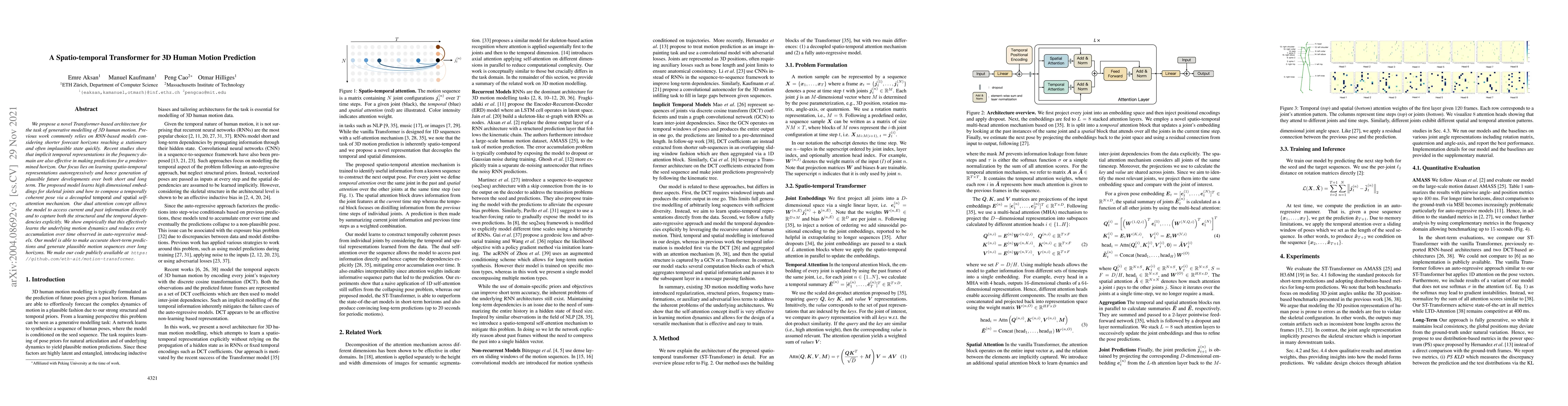 This paper introduces a Transformer-based architecture for 3D human motion prediction, utilizing a dual attention mechanism to learn spatial and temporal dependencies, achieving accurate short-term predictions and plausible long-term motion sequences without error accumulation. The model is publicly available for further research.