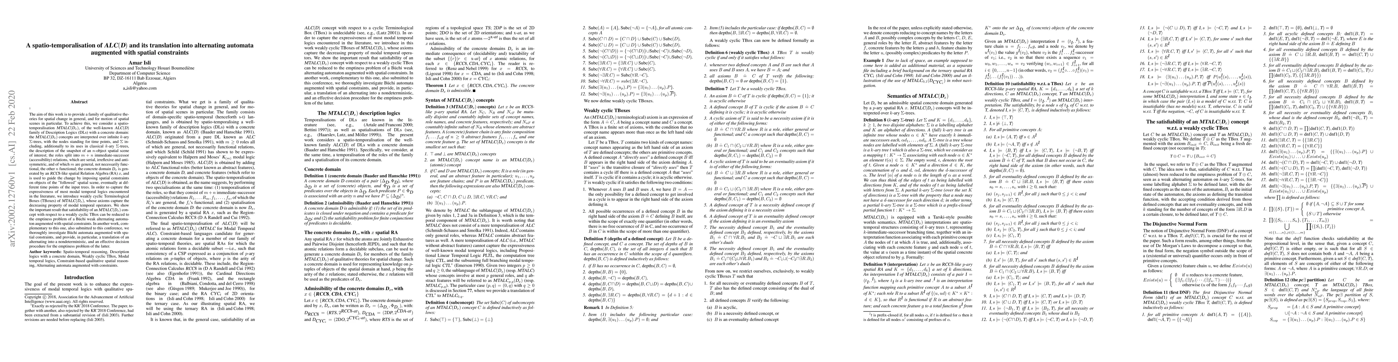 The aim of this work is to provide a family of qualitative theories for spatial change in general, and for motion of spatial scenes in particular. To achieve this, we consider a spatio-temporalisation MTALC(Dx), of the well-known ALC(D) family of Description Logics (DLs) with a concrete domain: the MTALC(Dx) concepts are interpreted over infinite k-ary Sigma-trees, with the nodes standing for time points, and Sigma including, additionally to its uses in classical k-ary Sigma-trees, the description of the snapshot of an n-object spatial scene of interest; the roles split into m+n immediate-successor (accessibility) relations, which are serial, irreflexive and antisymmetric, and of which m are general, not necessarily functional, the other n functional; the concrete domain Dx is generated by an RCC8-like spatial Relation Algebra (RA) x, and is used to guide the change by imposing spatial constraints on objects of the "followed" spatial scene, eventually at different time points of the input trees. In order to capture the expressiveness of most modal temporal logics encountered in the literature, we introduce weakly cyclic Terminological Boxes (TBoxes) of MTALC(Dx), whose axioms capture the decreasing property of modal temporal operators. We show the important result that satisfiability of an MTALC(Dx) concept with respect to a weakly cyclic TBox can be reduced to the emptiness problem of a Buchi weak alternating automaton augmented with spatial constraints. In another work, complementary to this one, also submitted to this conference, we thoroughly investigate Buchi automata augmented with spatial constraints, and provide, in particular, a translation of an alternating into a nondeterministic, and an effective decision procedure for the emptiness problem of the latter.
