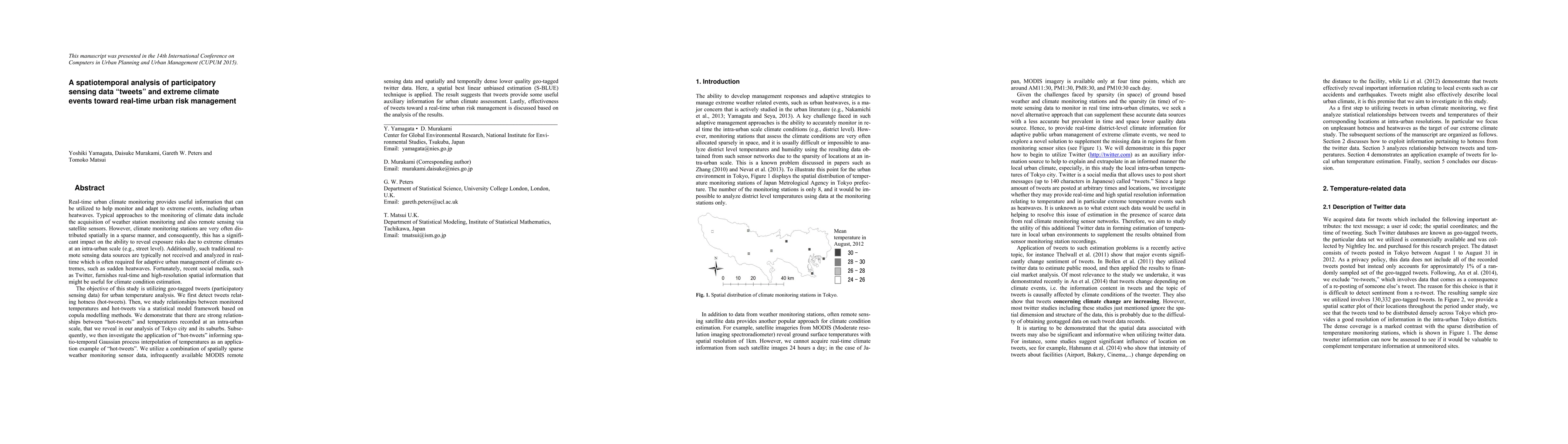 Real-time urban climate monitoring provides useful information that can be utilized to help monitor and adapt to extreme events, including urban heatwaves. Typical approaches to the monitoring of climate data include weather station monitoring and remote sensing. However, climate monitoring stations are very often distributed spatially in a sparse manner, and consequently, this has a significant impact on the ability to reveal exposure risks due to extreme climates at an intra-urban scale. Additionally, traditional remote sensing data sources are typically not received and analyzed in real-time which is often required for adaptive urban management of climate extremes, such as sudden heatwaves. Fortunately, recent social media, such as Twitter, furnishes real-time and high-resolution spatial information that might be useful for climate condition estimation. The objective of this study is utilizing geo-tagged tweets (participatory sensing data) for urban temperature analysis. We first detect tweets relating hotness (hot-tweets). Then, we study relationships between monitored temperatures and hot-tweets via a statistical model framework based on copula modelling methods. We demonstrate that there are strong relationships between "hot-tweets" and temperatures recorded at an intra-urban scale. Subsequently, we then investigate the application of "hot-tweets" informing spatio-temporal Gaussian process interpolation of temperatures as an application example of "hot-tweets". We utilize a combination of spatially sparse weather monitoring sensor data and spatially and temporally dense lower quality twitter data. Here, a spatial best linear unbiased estimation technique is applied. The result suggests that tweets provide some useful auxiliary information for urban climate assessment. Lastly, effectiveness of tweets toward a real-time urban risk management is discussed based on the results.