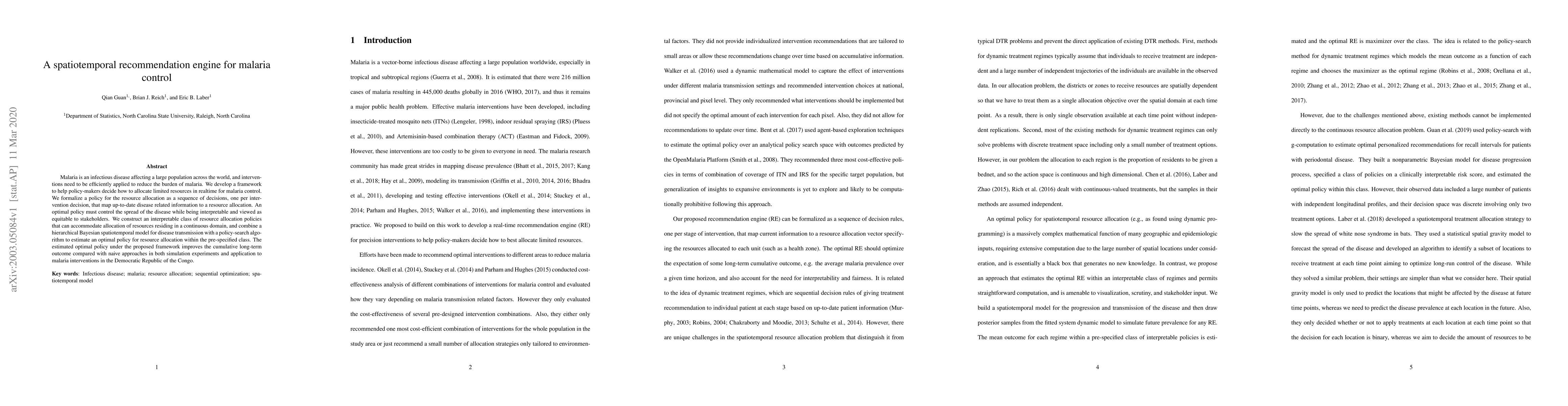 This paper proposes a spatiotemporal recommendation engine to optimize real-time resource allocation for malaria control, combining a hierarchical Bayesian model with a policy-search algorithm to estimate optimal policies. The framework improves long-term outcomes compared to naive approaches, demonstrated through simulations and applications in the Democratic Republic of the Congo.