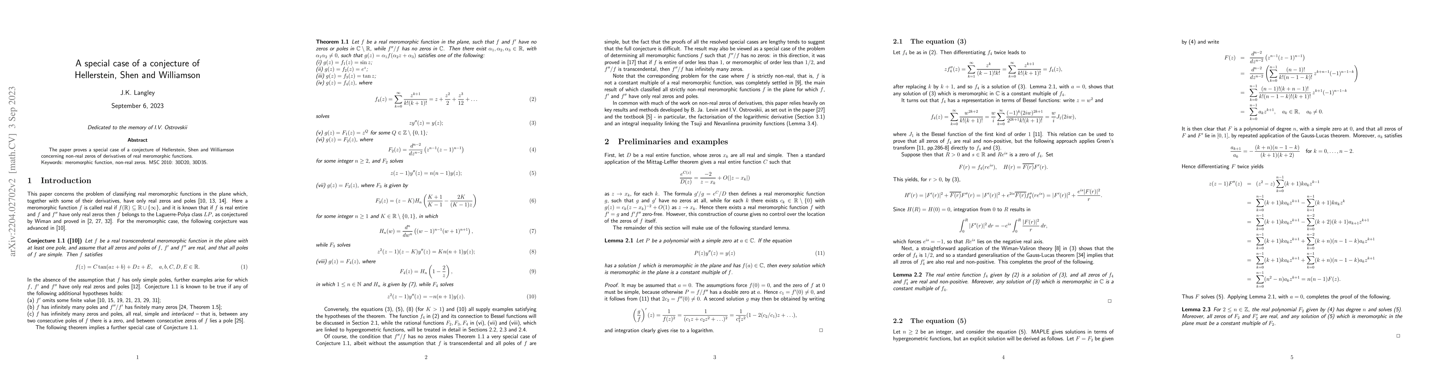 The paper proves a special case of a conjecture of Hellerstein, Shen and Williamson concerning non-real zeros of derivatives of real meromorphic functions.