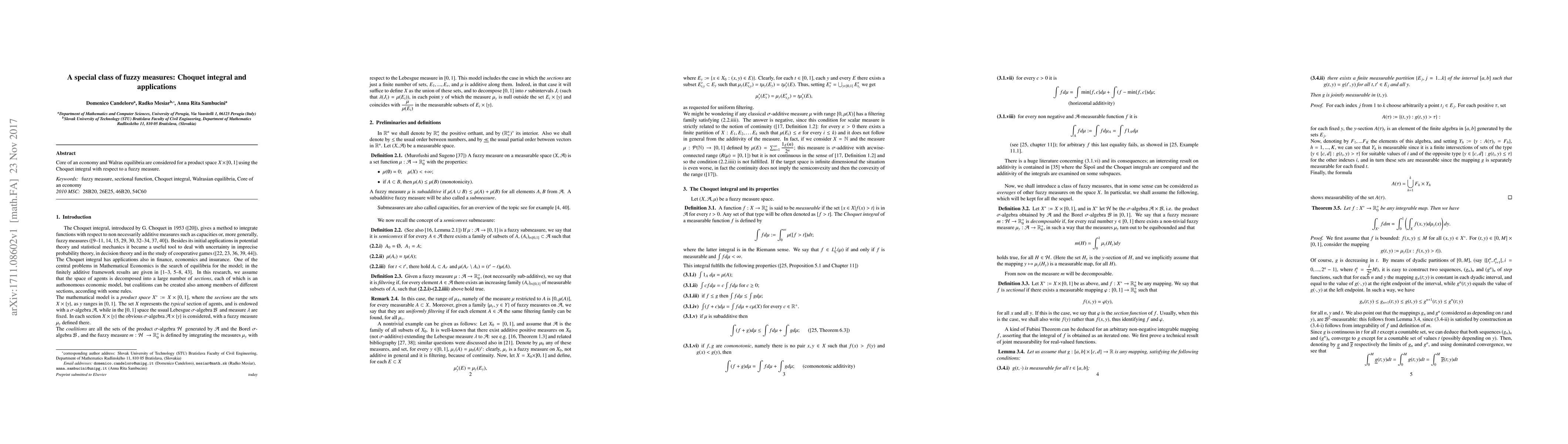 This paper explores the application of the Choquet integral with respect to fuzzy measures in analyzing core properties and Walras equilibria within an economy defined over a product space $X \times [0,1]$. It highlights the utility of fuzzy measures in economic theory.