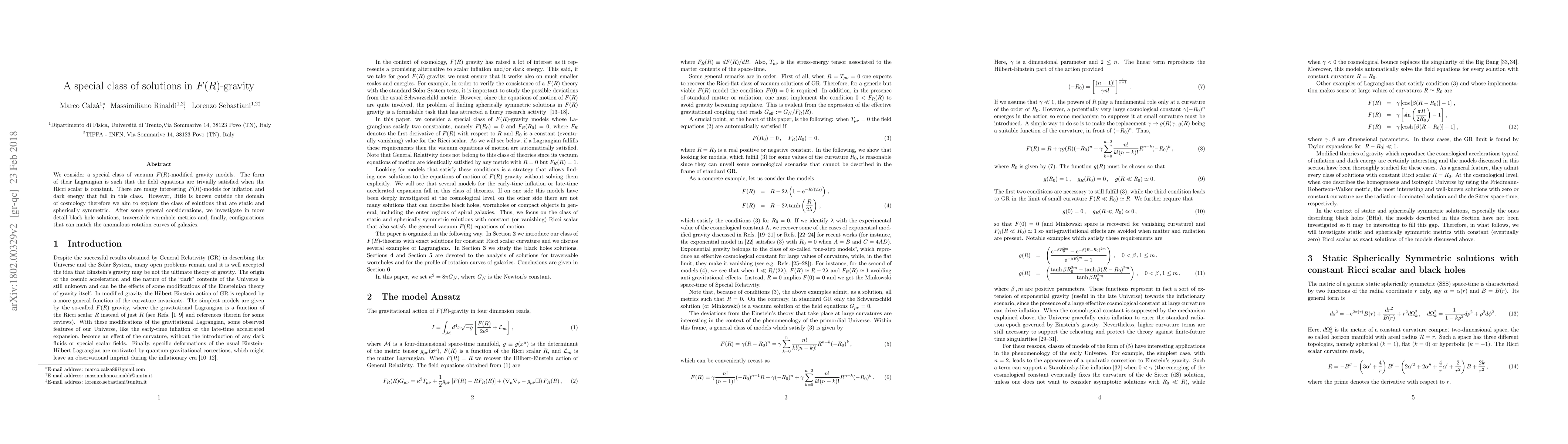 We consider a special class of vacuum $F(R)$-modified gravity models. The form of their Lagrangian is such that the field equations are trivially satisfied when the Ricci scalar is constant. There are many interesting $F(R)$-models for inflation and dark energy that fall in this class. However, little is known outside the domain of cosmology therefore we aim to explore the class of solutions that are static and spherically symmetric. After some general considerations, we investigate in more detail black hole solutions, traversable wormhole metrics and, finally, configurations that can match the anomalous rotation curves of galaxies.