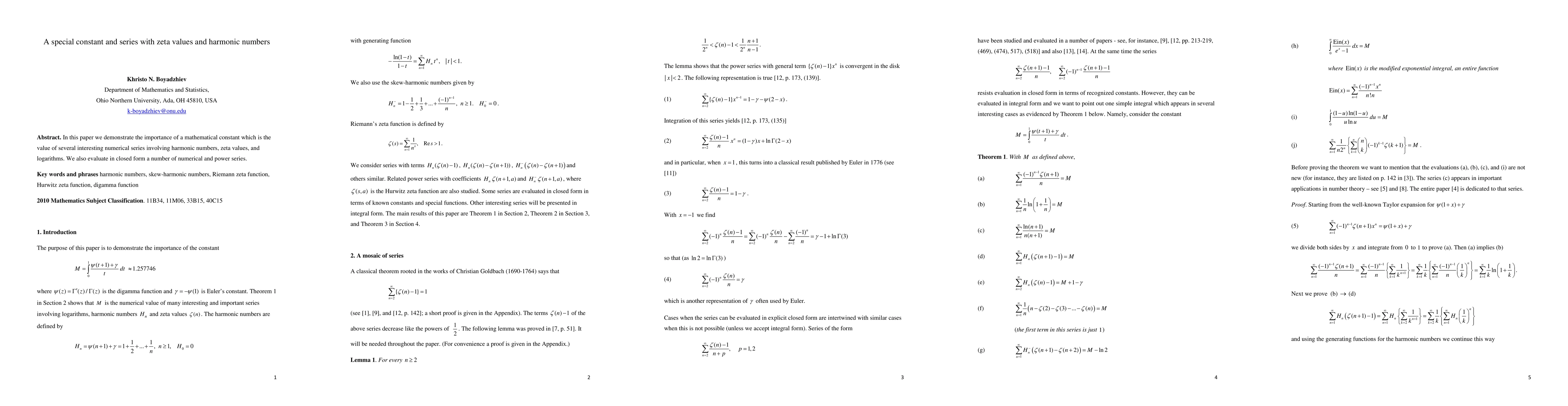 In this paper we demonstrate the importance of a mathematical constant which is the value of several interesting numerical series involving harmonic numbers, zeta values, and logarithms. We also evaluate in closed form a number of numerical and power series.