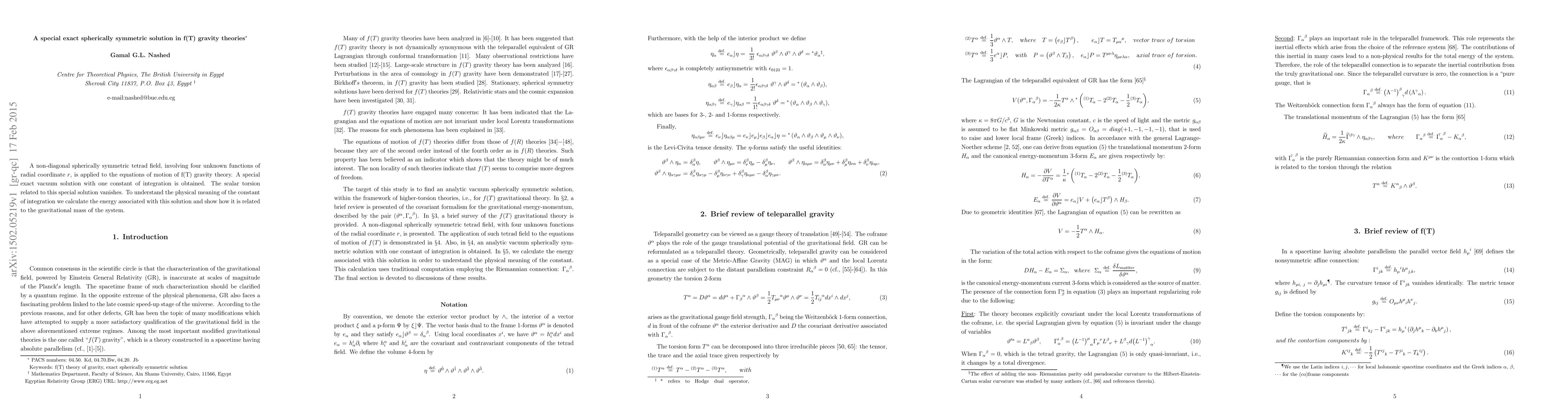 A non-diagonal spherically symmetric tetrad field, involving four unknown functions of radial coordinate $r$, is applied to the equations of motion of f(T) gravity theory. A special exact vacuum solution with one constant of integration is obtained. The scalar torsion related to this special solution vanishes. To understand the physical meaning of the constant of integration we calculate the energy associated with this solution and show how it is related to the gravitational mass of the system.