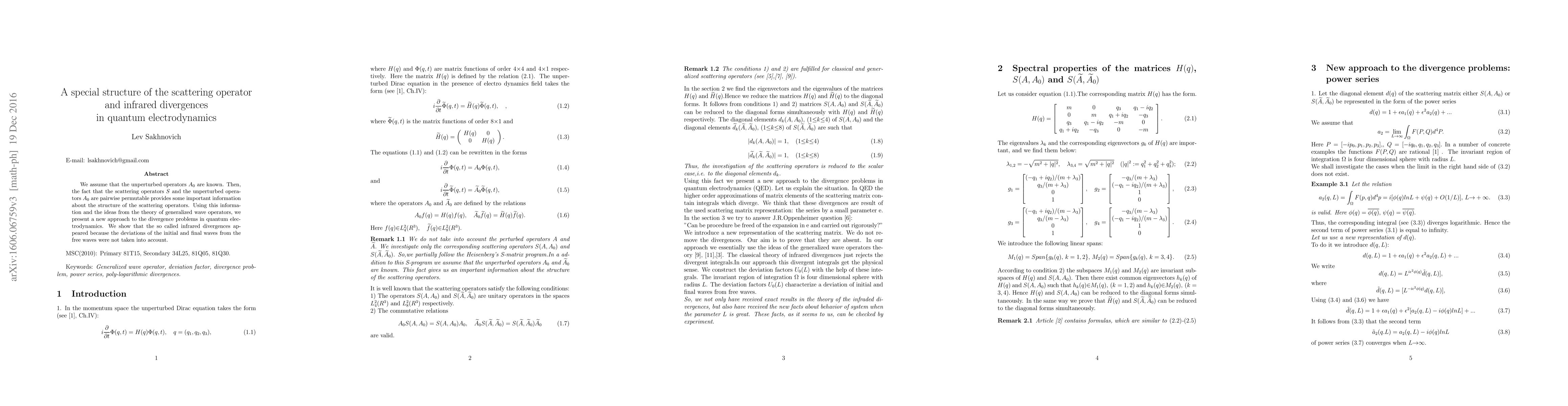 We assume that the unperturbed operators $A_0$ are known. Then, the fact that the scattering operators $S$ and the unperturbed operators $A_0$ are pairwise permutable provides some important information about the structure of the scattering operators. Using this information and the ideas from the theory of generalized wave operators, we present a new approach to the divergence problems in quantum electrodynamics. We show that the so called infrared divergences appeared because the deviations of the initial and final waves from the free waves were not taken into account.