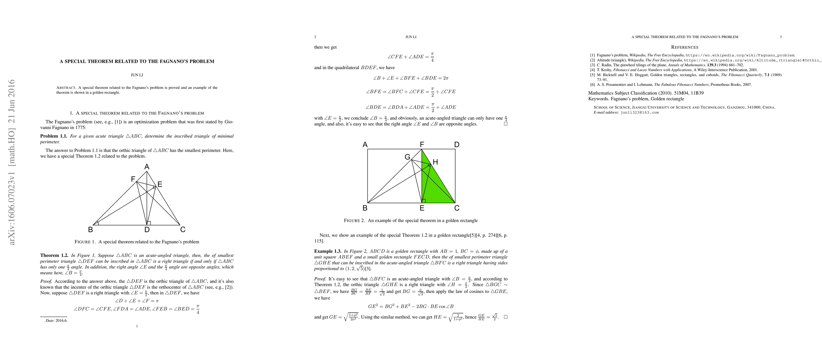 A special theorem related to the Fagnano's problem is proved and an example of the theorem is shown in a golden rectangle.