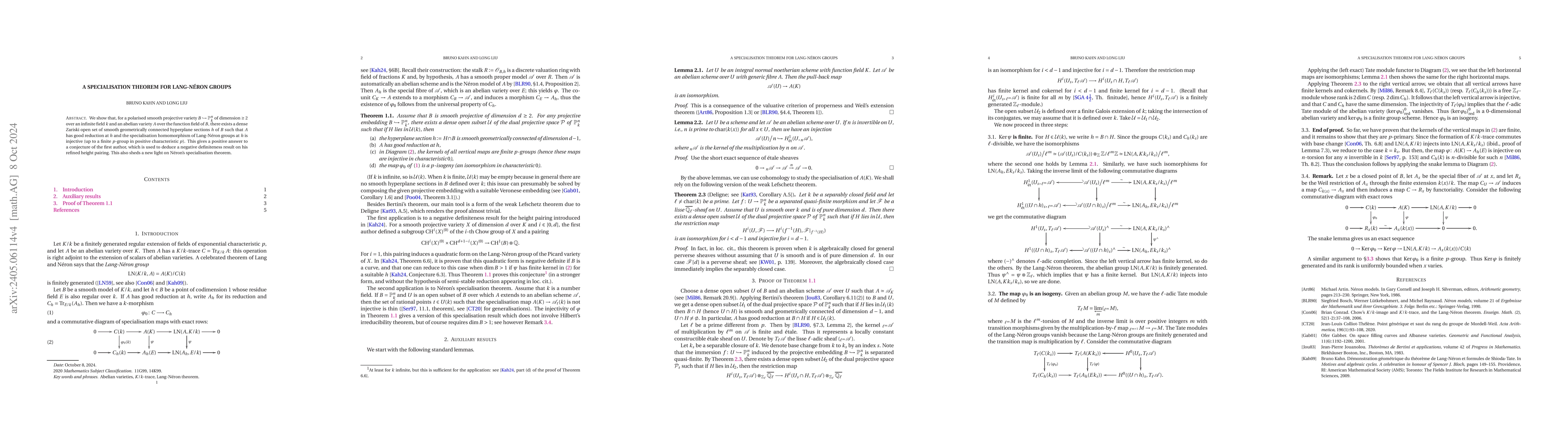 The paper proves the existence of dense hyperplane sections where the Lang-Néron groups' specialisation homomorphism is injective, affirming a conjecture and contributing to refined height pairings and Nérôn's specialisation theorem.