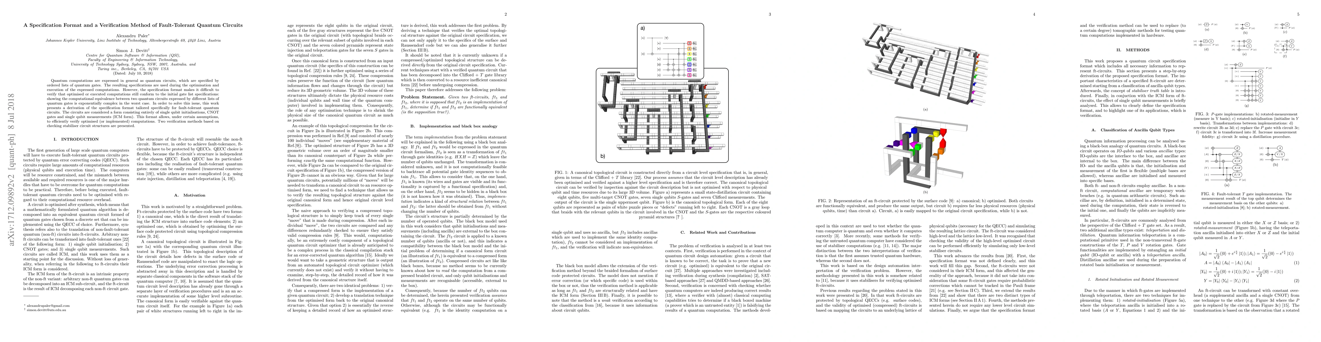 This paper proposes a specification format called ICM for fault-tolerant quantum circuits, consisting of single qubit initialisations, CNOT gates, and single qubit measurements. It introduces two verification methods based on stabiliser circuit structures to efficiently check the equivalence of optimised quantum computations.