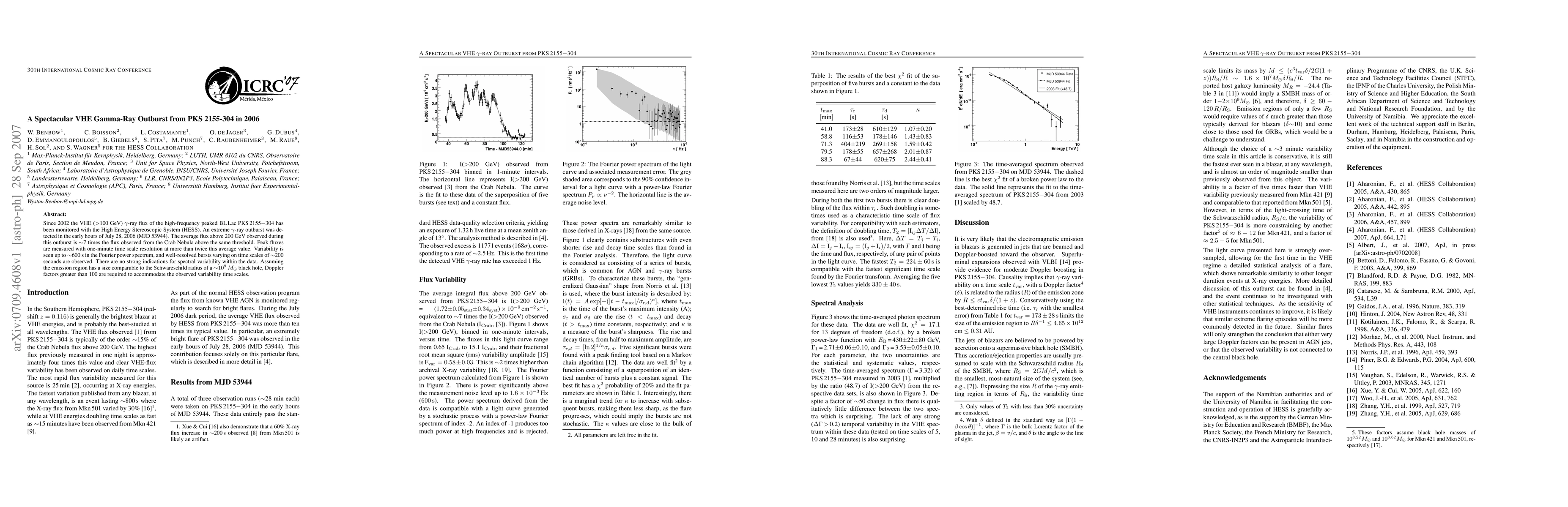 A gamma-ray outburst from PKS 2155-304 in 2006 was detected, with peak fluxes ~7 times that of the Crab Nebula, and variability on time scales of up to 600 seconds.