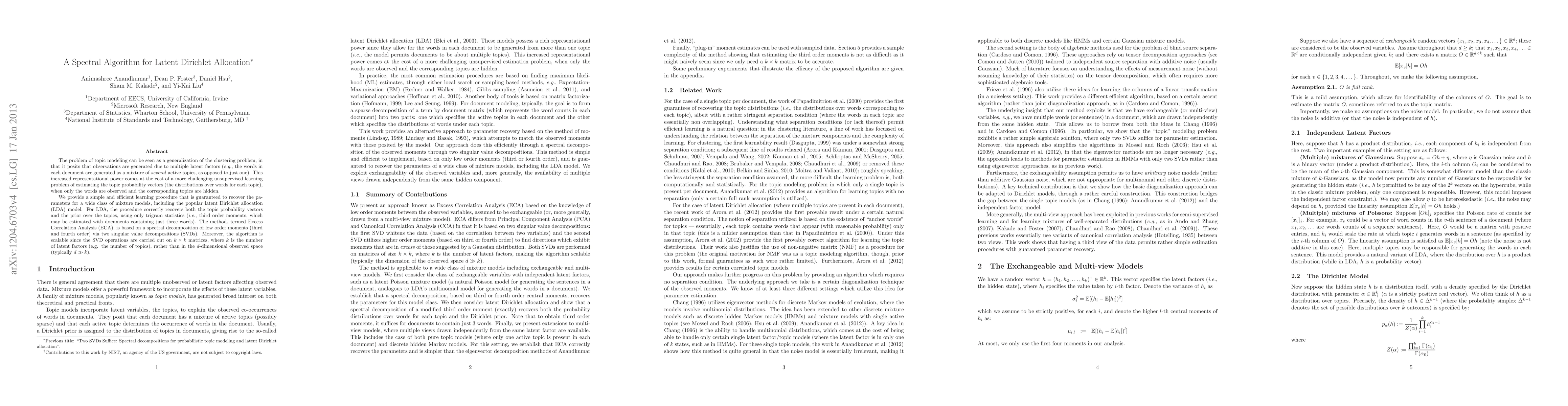 This research introduces a spectral algorithm called Excess Correlation Analysis (ECA) for accurately estimating parameters in Latent Dirichlet Allocation (LDA) models. The ECA method uses spectral decomposition of low-order moments, specifically trigram statistics, to recover topic probability vectors and priors over topics efficiently and scalably.
