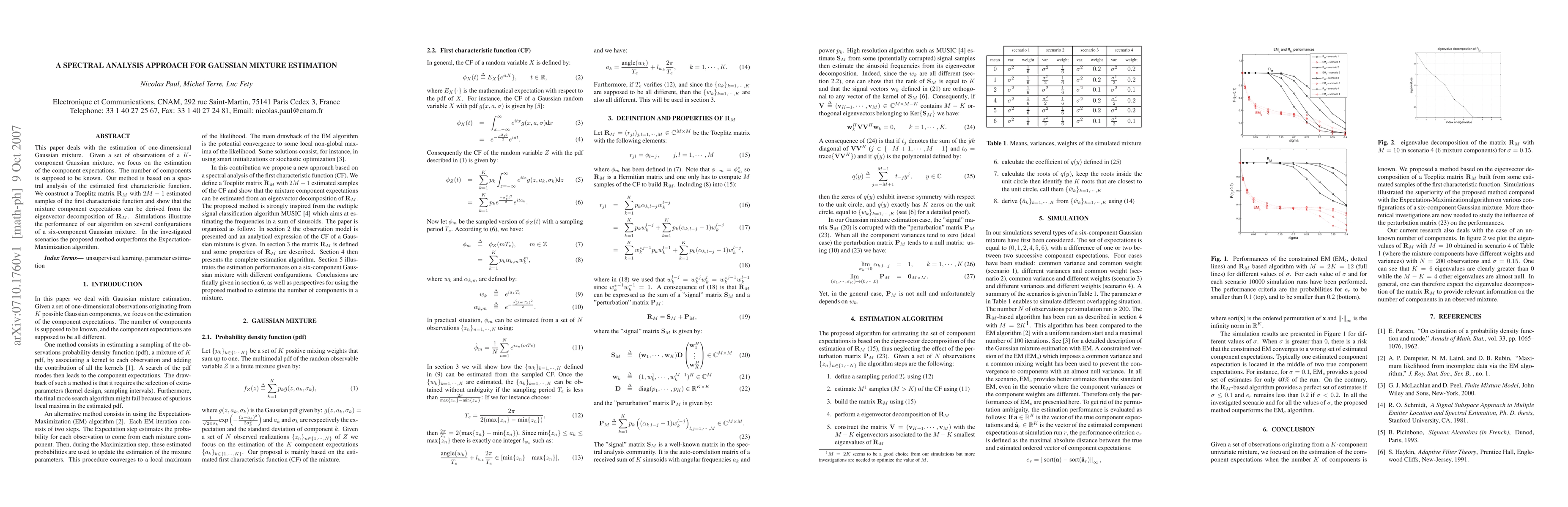 This paper proposes a spectral analysis method for estimating component expectations in a K-component Gaussian mixture, utilizing the first characteristic function and Toeplitz matrix eigenvector decomposition. Simulation results show superior performance compared to the Expectation-Maximization algorithm.