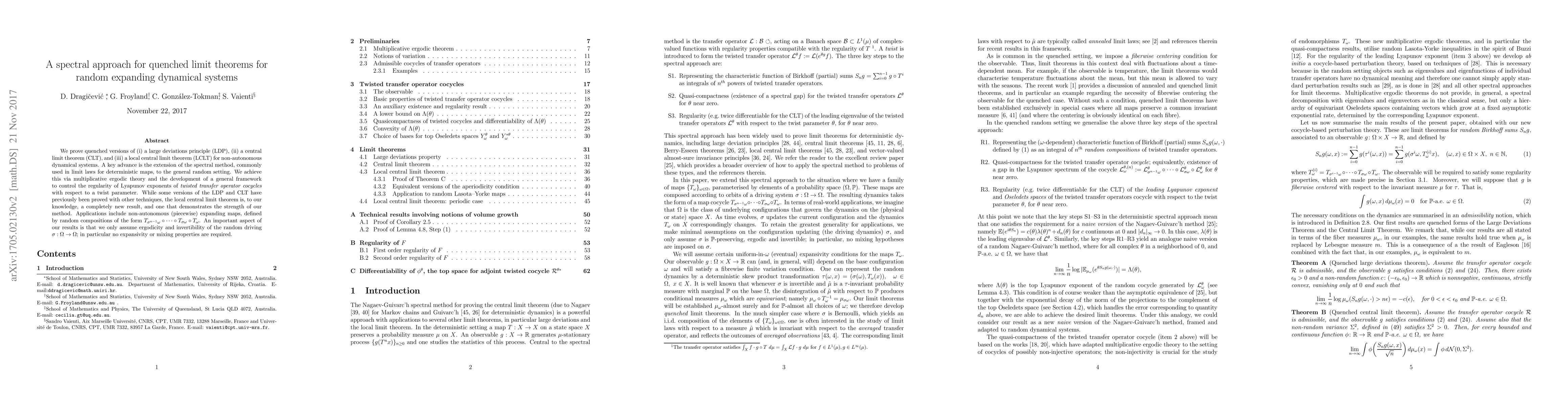We prove quenched versions of (i) a large deviations principle (LDP), (ii) a central limit theorem (CLT), and (iii) a local central limit theorem (LCLT) for non-autonomous dynamical systems. A key advance is the extension of the spectral method, commonly used in limit laws for deterministic maps, to the general random setting. We achieve this via multiplicative ergodic theory and the development of a general framework to control the regularity of Lyapunov exponents of \emph{twisted transfer operator cocycles} with respect to a twist parameter. While some versions of the LDP and CLT have previously been proved with other techniques, the local central limit theorem is, to our knowledge, a completely new result, and one that demonstrates the strength of our method. Applications include non-autonomous (piecewise) expanding maps, defined by random compositions of the form $T_{\sigma^{n-1}\omega}\circ\cdots\circ T_{\sigma\omega}\circ T_\omega$. An important aspect of our results is that we only assume ergodicity and invertibility of the random driving $\sigma:\Omega\to\Omega$; in particular no expansivity or mixing properties are