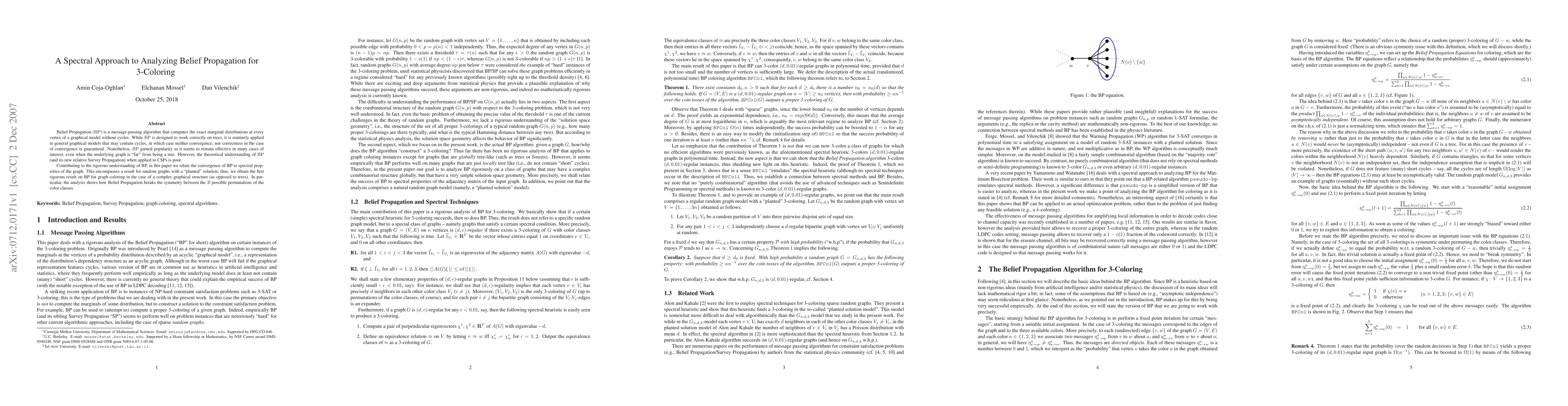 This paper rigorously analyzes the convergence of Belief Propagation (BP) for 3-coloring problems by linking it to spectral properties of the graph. It provides the first rigorous result for BP on complex graphical structures, demonstrating how BP breaks the symmetry among the $3!$ color permutations.