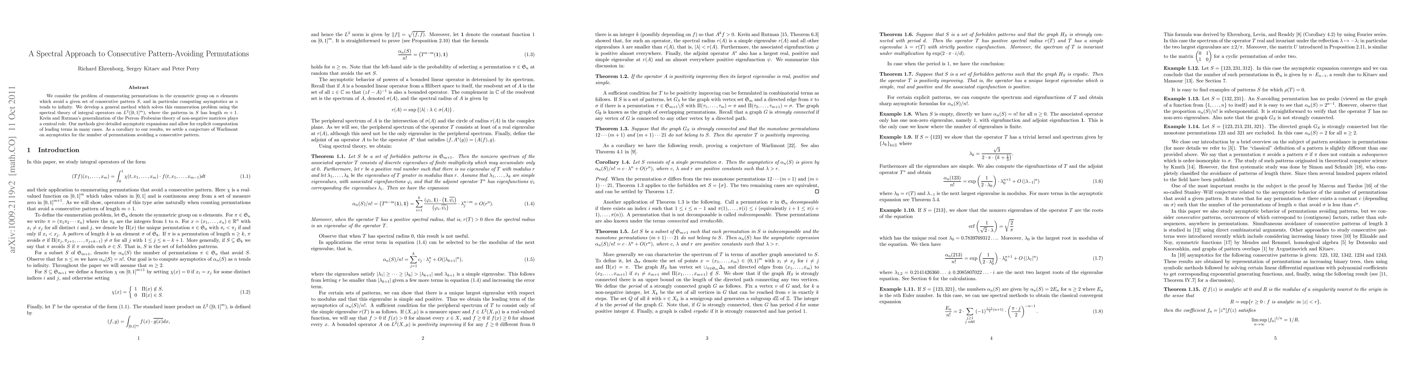 This paper develops a spectral approach using integral operators and Kreĭn-Rutman theory to enumerate consecutive pattern-avoiding permutations in the symmetric group, providing asymptotic expansions and solving a conjecture on the asymptotics for such permutations.