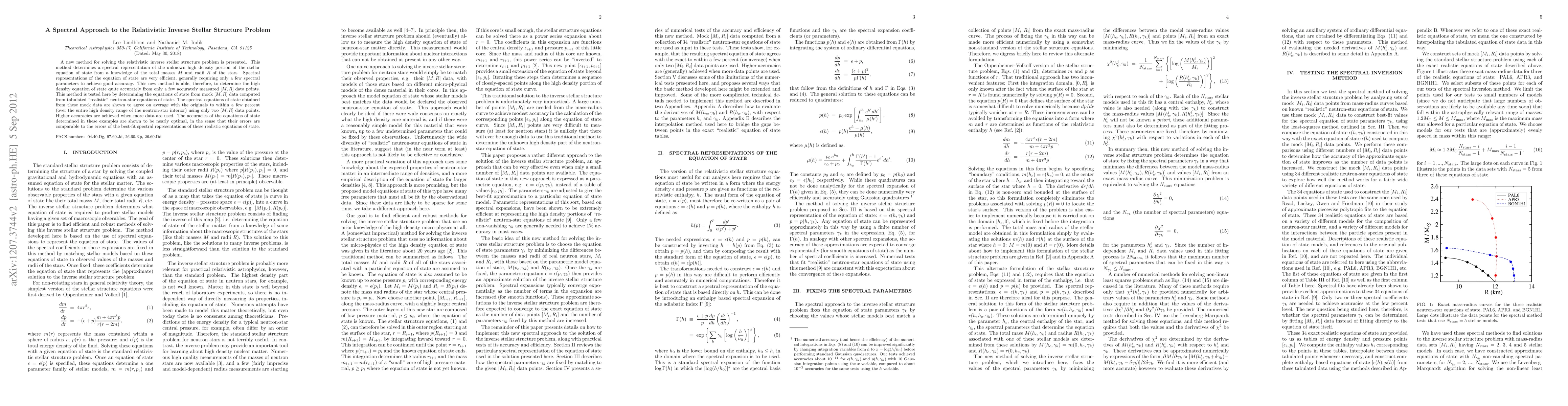 A new method for solving the relativistic inverse stellar structure problem is presented. This method determines a spectral representation of the unknown high density portion of the stellar equation of state from a knowledge of the total masses M and radii R of the stars. Spectral representations of the equation of state are very efficient, generally requiring only a few spectral parameters to achieve good accuracy. This new method is able, therefore, to determine the high density equation of state quite accurately from only a few accurately measured [M,R] data points. This method is tested here by determining the equations of state from mock [M,R] data computed from tabulated "realistic" neutron-star equations of state. The spectral equations of state obtained from these mock data are shown to agree on average with the originals to within a few percent (over the entire high density range of the neutron-star interior) using only two [M,R] data points. Higher accuracies are achieved when more data are used. The accuracies of the equations of state determined in these examples are shown to be nearly optimal, in the sense that their errors are comparable to the errors of the best-fit spectral representations of these realistic equations of state.