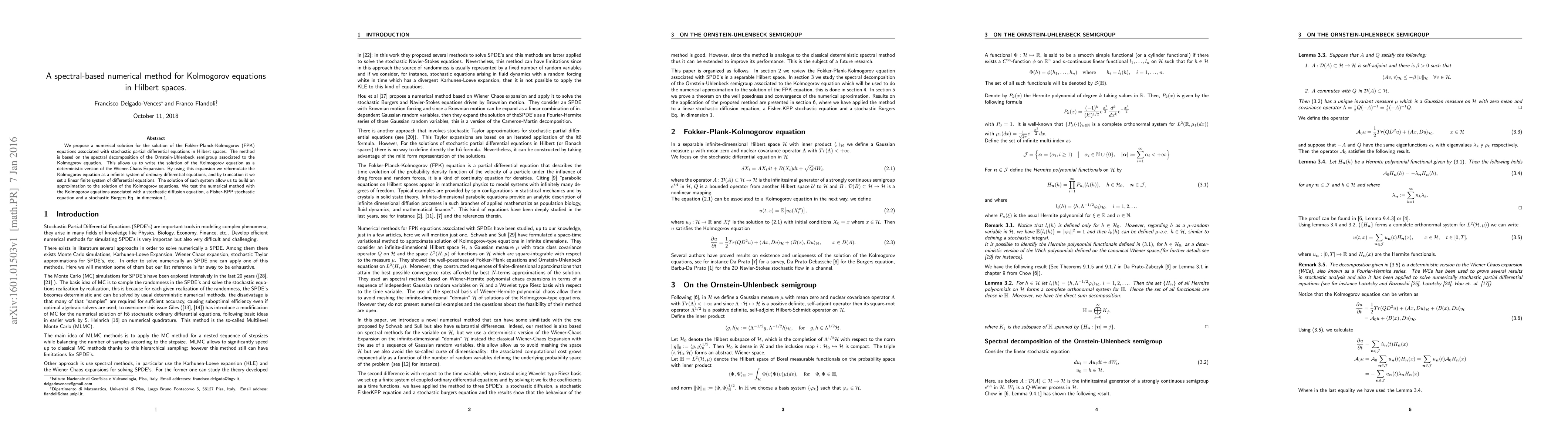We propose a numerical solution for the solution of the Fokker-Planck-Kolmogorov (FPK) equations associated with stochastic partial differential equations in Hilbert spaces. The method is based on the spectral decomposition of the Ornstein-Uhlenbeck semigroup associated to the Kolmogorov equation. This allows us to write the solution of the Kolmogorov equation as a deterministic version of the Wiener-Chaos Expansion. By using this expansion we reformulate the Kolmogorov equation as a infinite system of ordinary differential equations, and by truncation it we set a linear finite system of differential equations. The solution of such system allow us to build an approximation to the solution of the Kolmogorov equations. We test the numerical method with the Kolmogorov equations associated with a stochastic diffusion equation, a Fisher-KPP stochastic equation and a stochastic Burgers Eq. in dimension 1.