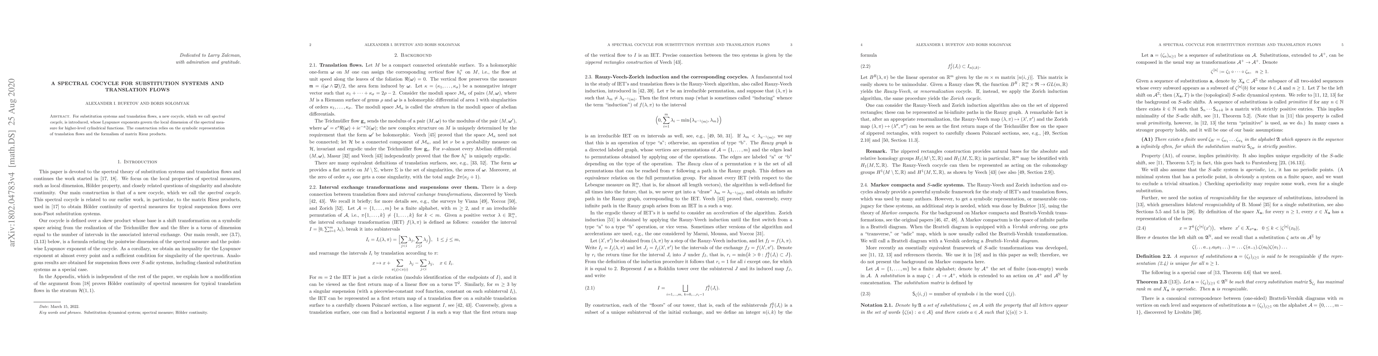 Summary: This paper introduces a spectral cocycle for substitution systems and translation flows, where the Lyapunov exponents determine the local dimension of the spectral measure for higher-level cylindrical functions, leveraging symbolic representation and matrix Riesz products.