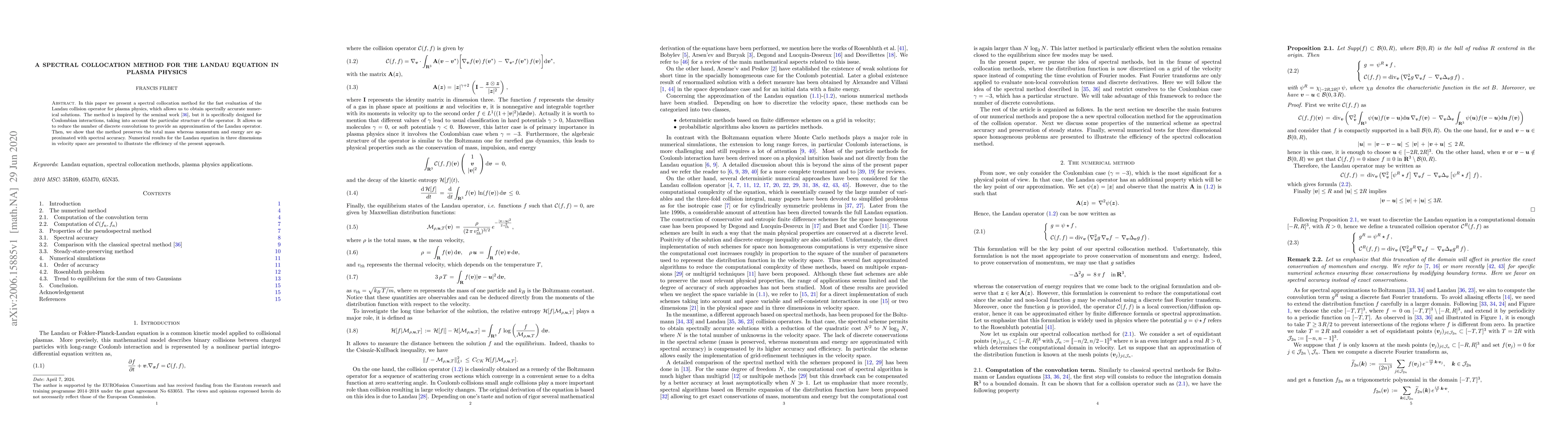 In this paper we present a spectral collocation method for the fast evaluation of the Landau collision operator for plasma physics, which allows us to obtain spectrally accurate numerical solutions. The method is inspired by the seminal work [36], but it is specifically designed for Coulombian interactions, taking into account the particular structure of the operator. It allows us to reduce the number of discrete convolutions to provide an approximation of the Landau operator. Then, we show that the method preserves the total mass whereas momentum and energy are approximated with spectral accuracy. Numerical results for the Landau equation in three dimensions in velocity space are presented to illustrate the efficiency of the present approach.