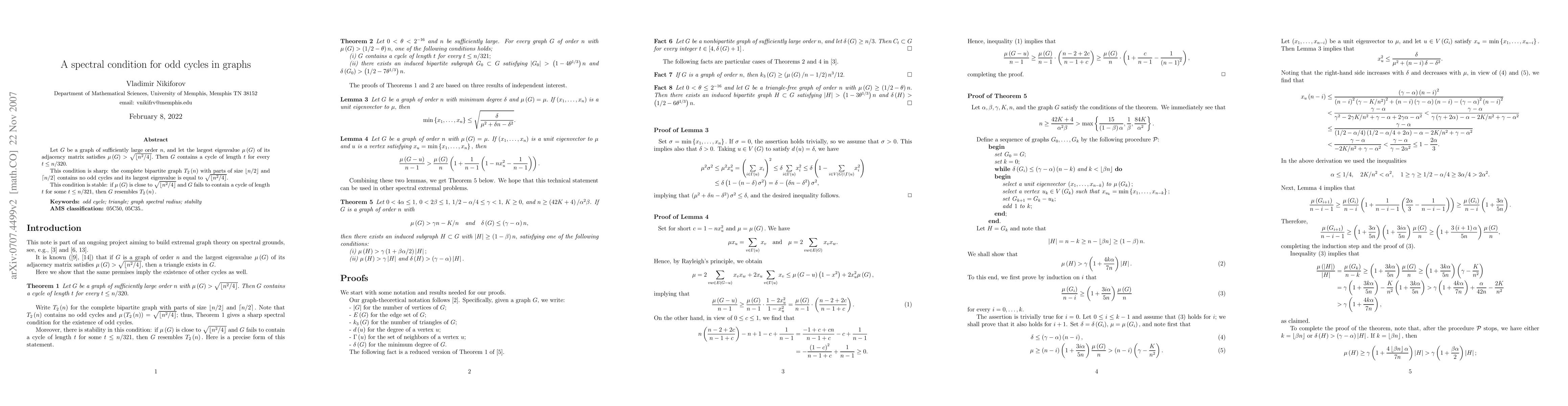 We give a sharp spectral condition for the existence of odd cycles in a graph of given order. We also prove a related stability result.