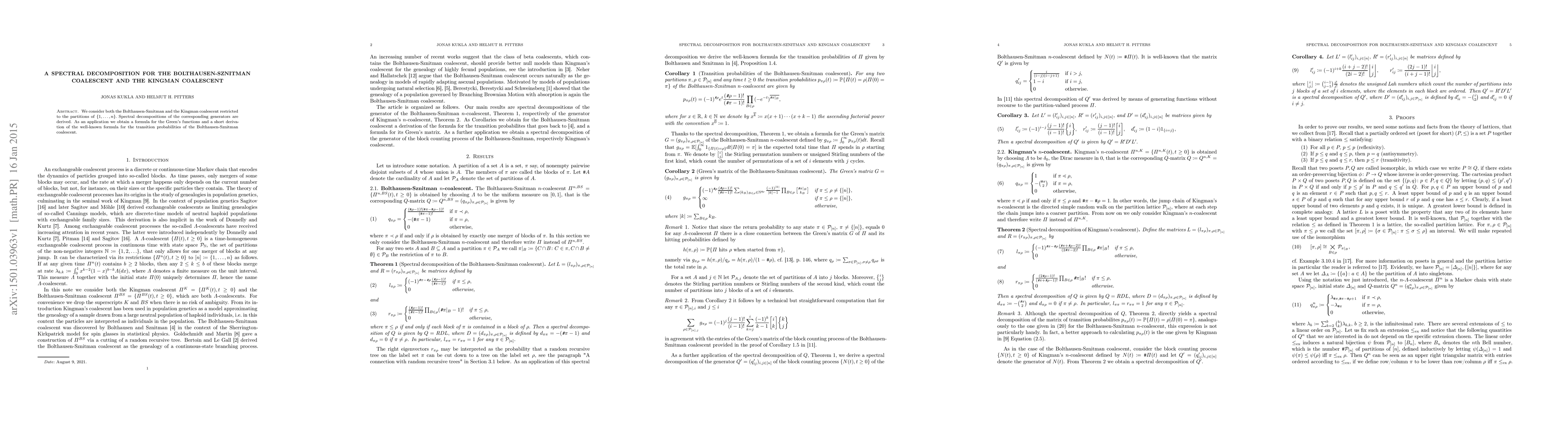 This paper derives spectral decompositions for the generators of the Bolthausen-Sznitman and Kingman coalescent processes, leading to formulas for their Green's functions and transition probabilities.