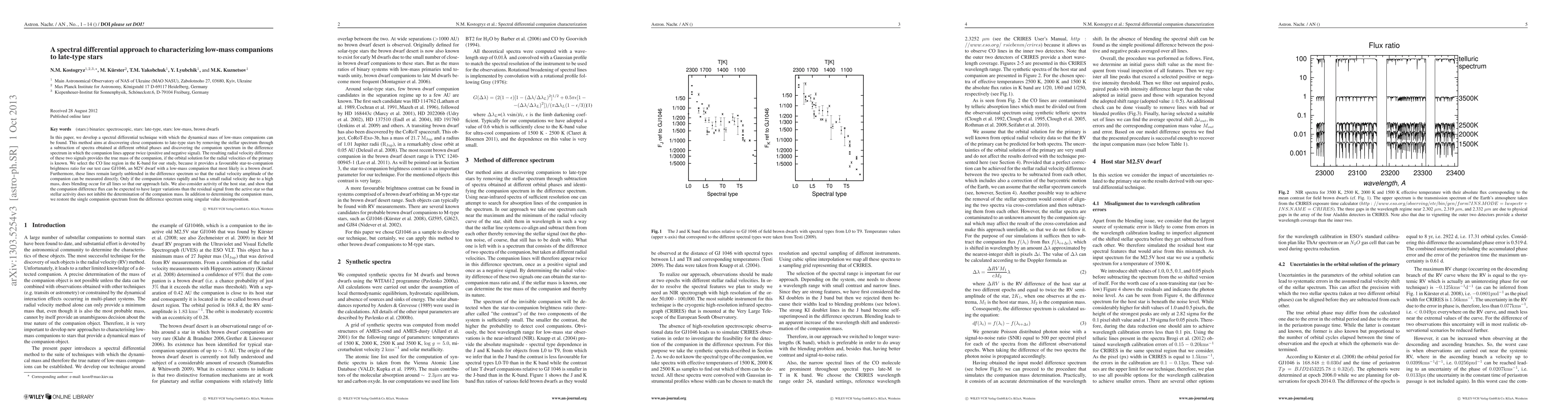 In this paper, we develop a spectral differential technique with which the dynamical mass of low-mass companions can be found. This method aims at discovering close companions to late-type stars by removing the stellar spectrum through a subtraction of spectra obtained at different orbital phases and discovering the companion spectrum in the difference spectrum in which the companion lines appear twice (positive and negative signal). The resulting radial velocity difference of these two signals provides the true mass of the companion, if the orbital solution for the radial velocities of the primary is known. We select the CO line region in the K-band for our study, because it provides a favourable star-to-companion brightness ratio for our test case GJ1046, an M2V dwarf with a low-mass companion that most likely is a brown dwarf. Furthermore, these lines remain largely unblended in the difference spectrum so that the radial velocity amplitude of the companion can be measured directly. Only if the companion rotates rapidly and has a small radial velocity due to a high mass, does blending occur for all lines so that our approach fails. We also consider activity of the host star, and show that the companion difference flux can be expected to have larger amplitude than the residual signal from the active star so that stellar activity does not inhibit the determination of the companion mass. In addition to determining the companion mass, we restore the single companion spectrum from the difference spectrum using singular value decomposition.