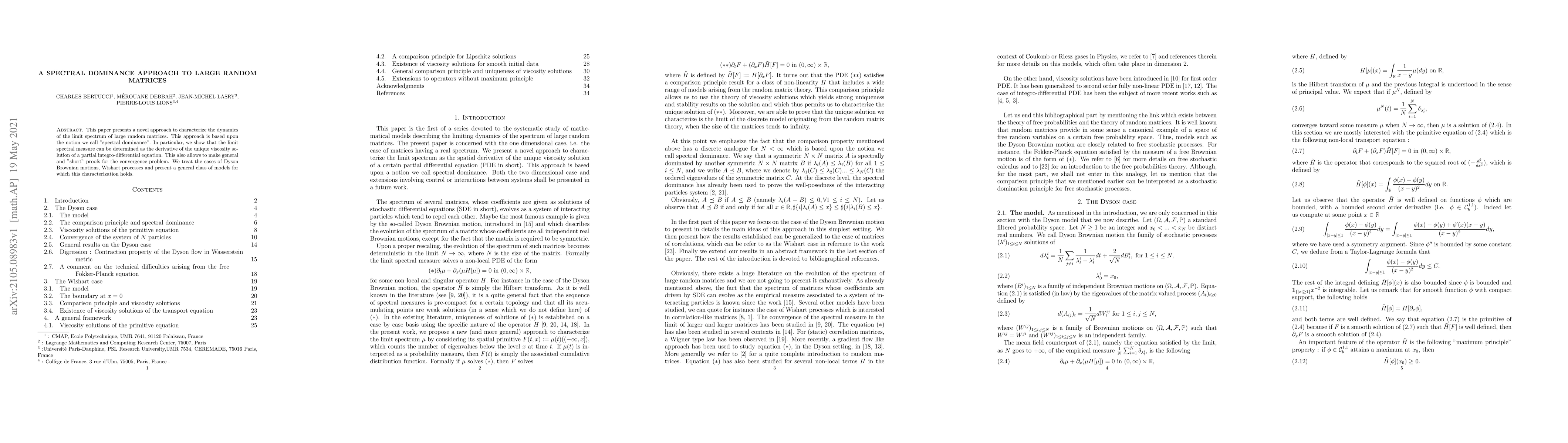 This paper introduces a new approach to study large random matrices, focusing on spectral dominance, which allows for short proofs of convergence and characterizes the limit spectrum using viscosity solutions to partial integro-differential equations.