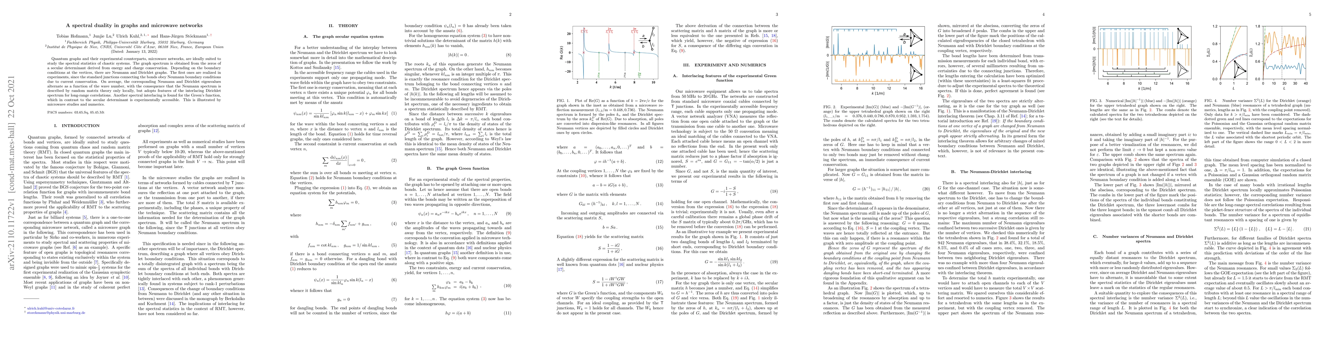 Quantum graphs and their experimental counterparts, microwave networks, are ideally suited to study the spectral statistics of chaotic systems. The graph spectrum is obtained from the zeros of a secular determinant derived from energy and charge conservation. Depending on the boundary conditions at the vertices, there are Neumann and Dirichlet graphs. The first ones are realized in experiments, since the standard junctions connecting the bonds obey Neumann boundary conditions due to current conservation. On average, the corresponding Neumann and Dirichlet eigenvalues alternate as a function of the wave number, with the consequence that the Neumann spectrum is described by random matrix theory only locally, but adopts features of the interlacing Dirichlet spectrum for long-range correlations. Another spectral interlacing is found for the Green's function, which in contrast to the secular determinant is experimentally accessible. This is illustrated by microwave studies and numerics.