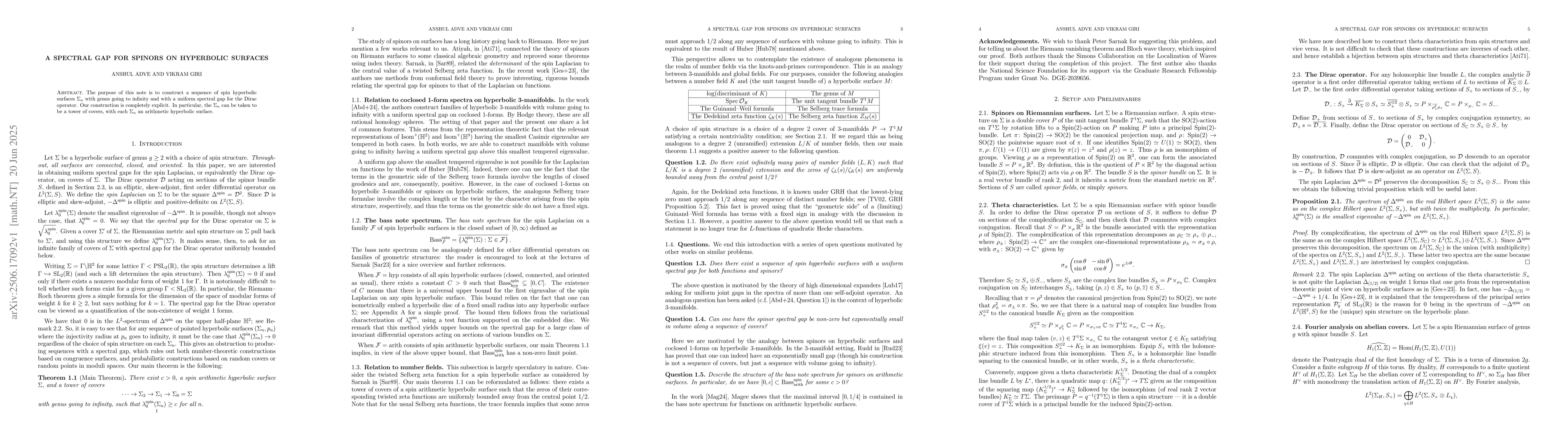 The purpose of this note is to construct a sequence of spin hyperbolic surfaces $\Sigma_n$ with genus going to infinity and with a uniform spectral gap for the Dirac operator. Our construction is completely explicit. In particular, the $\Sigma_n$ can be taken to be a tower of covers, with each $\Sigma_n$ an arithmetic hyperbolic surface.